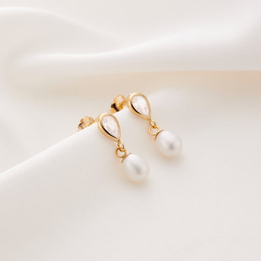 9ct Gold CZ & Hanging Pearl Stud Earrings