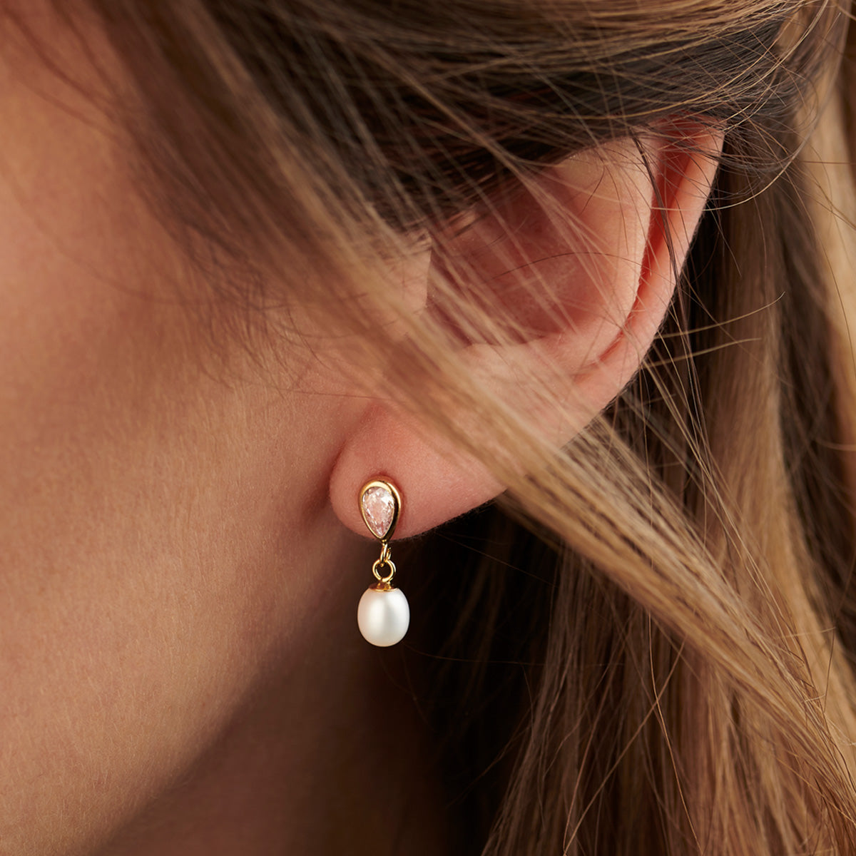 9ct Gold CZ & Hanging Pearl Stud Earrings