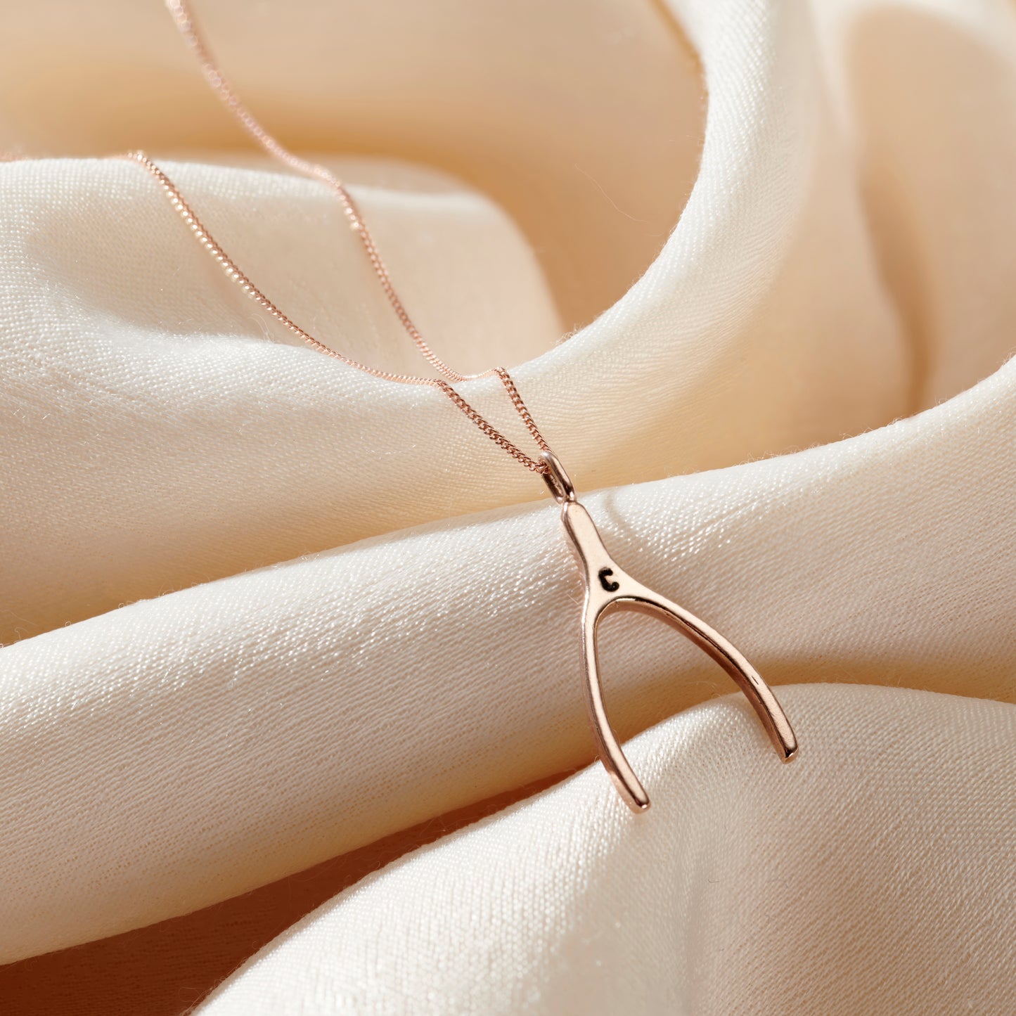 The beautiful 9ct Rose Gold Lucky Wishbone Necklace is handmade from precious gold in our Brighton workshop. The design consists of a delicate lucky wishbone pendant, a miniature circle tag at the clasp and ...