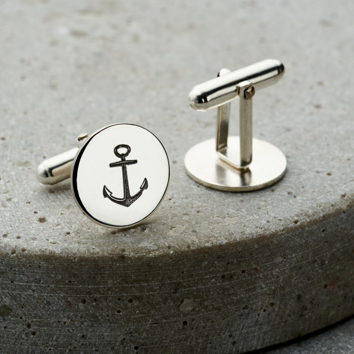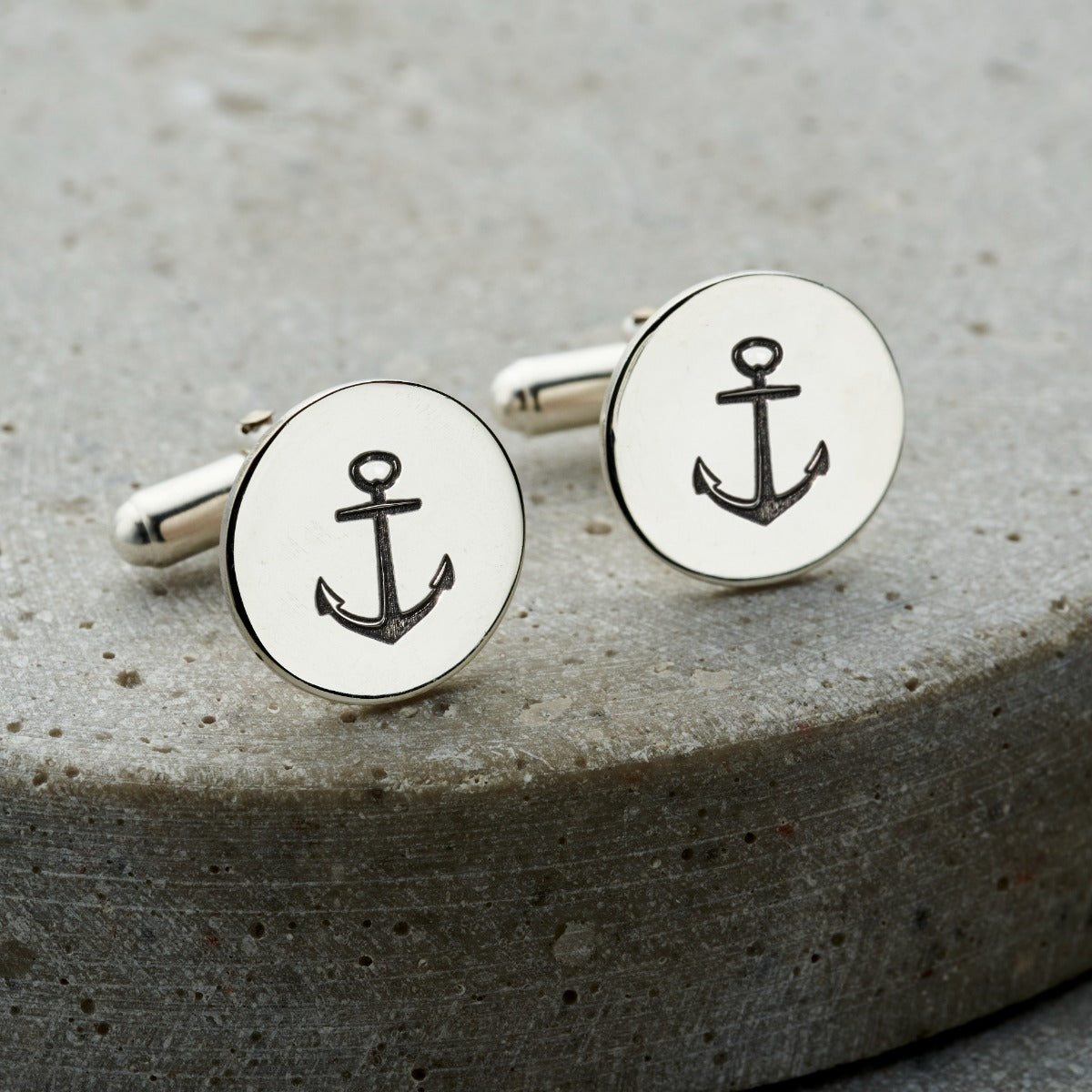 These gorgeous round cufflinks are made from Sterling Silver. The round disc is engraved with a unique anchor symbol and finished with a classic cufflink back. These silver anchor cufflinks are the perfect g...