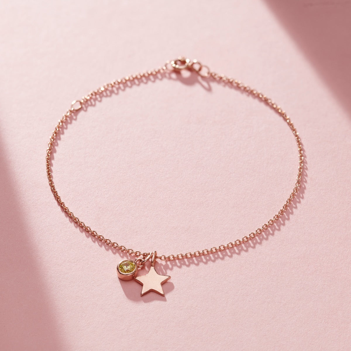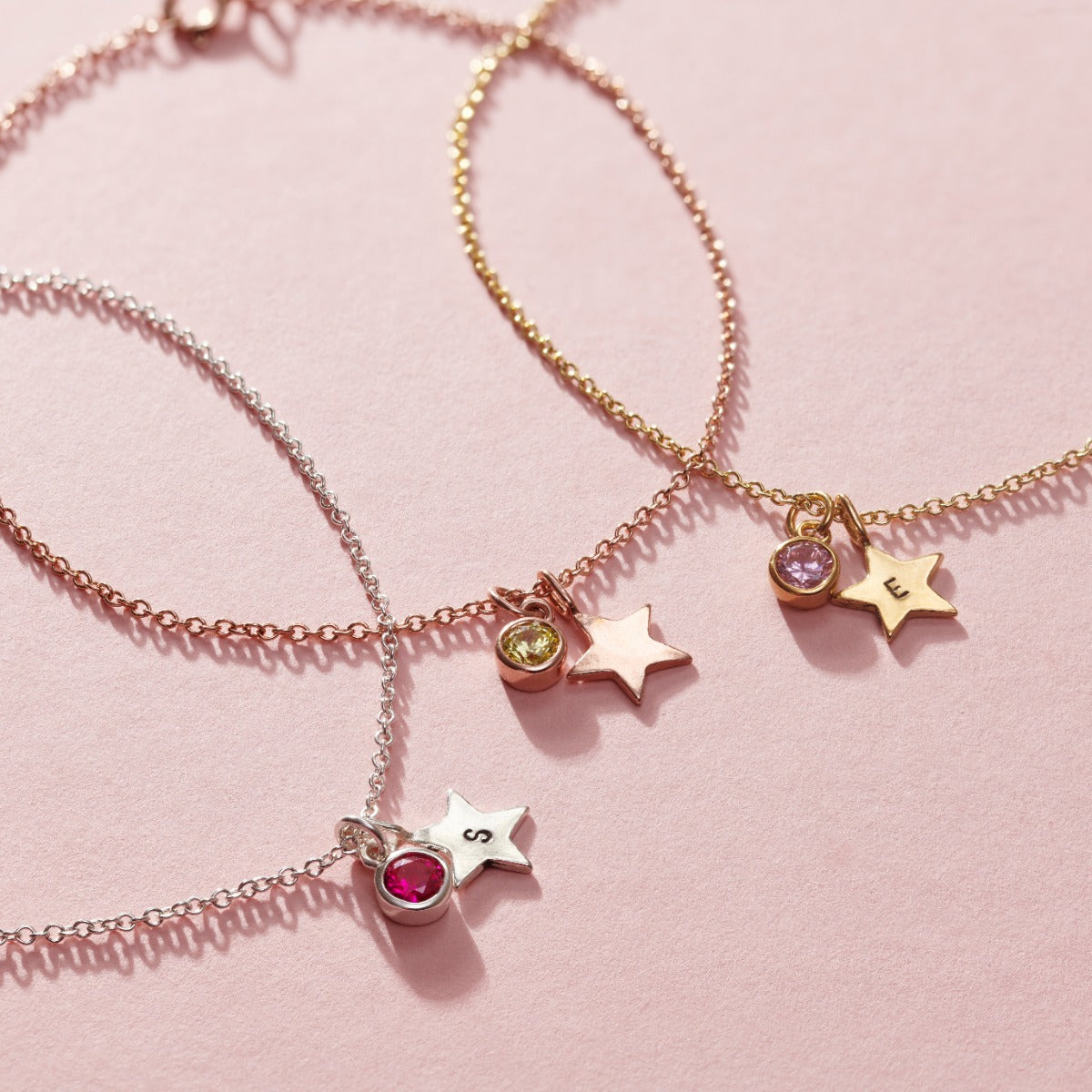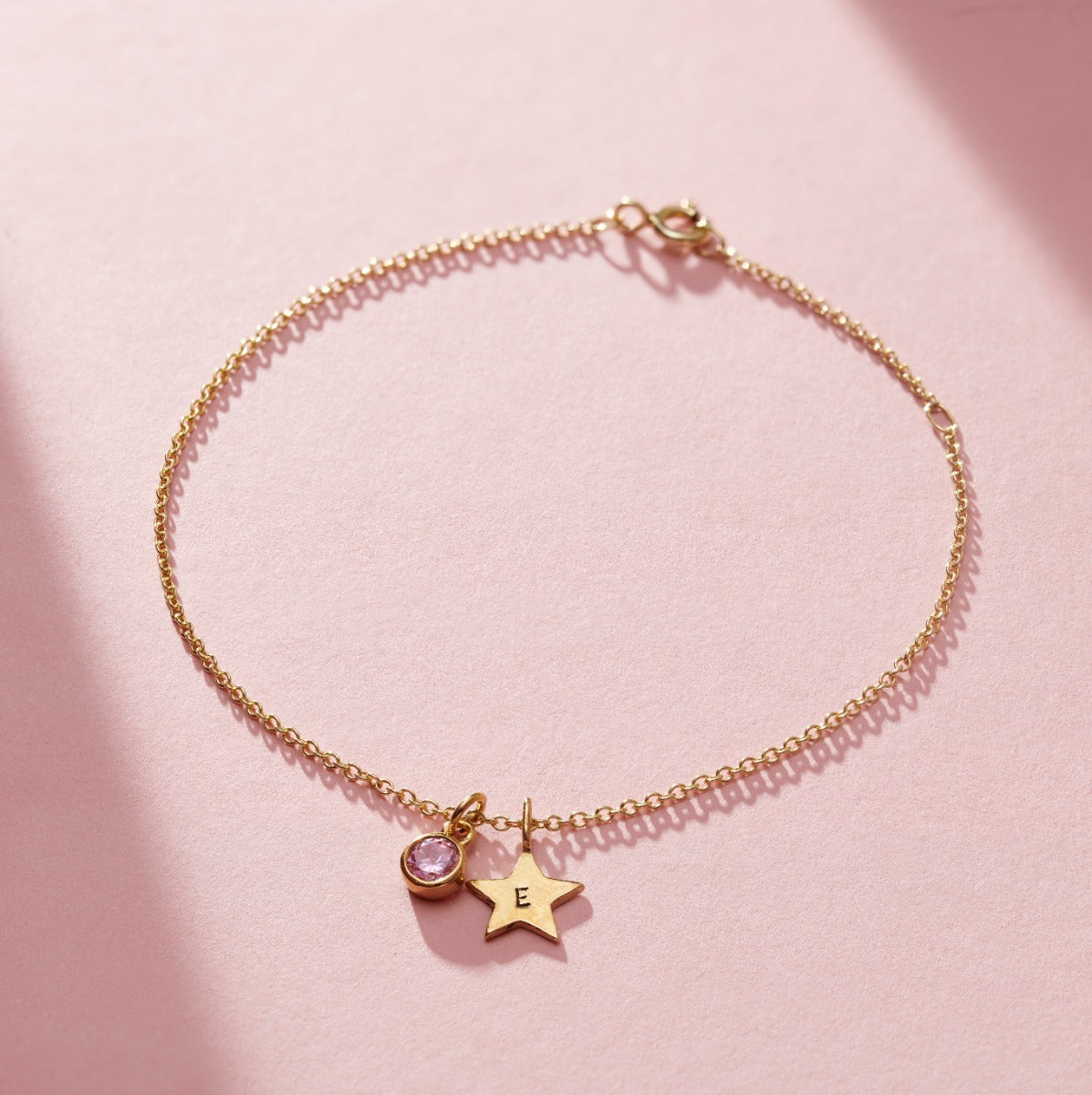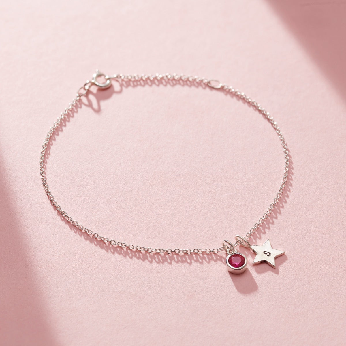 This gorgeous charm bracelet is made in our Brighton workshop from sterling silver. Your chosen birthstone is suspended from one of our classic trace chain bracelets. Hanging next to your birthstone is a dai...