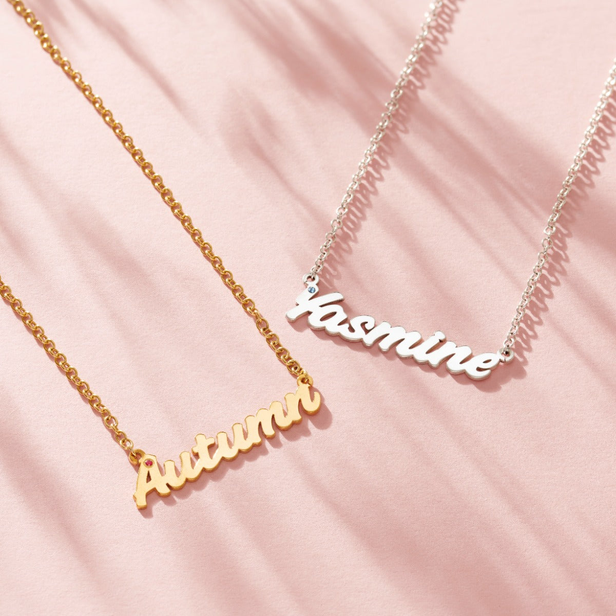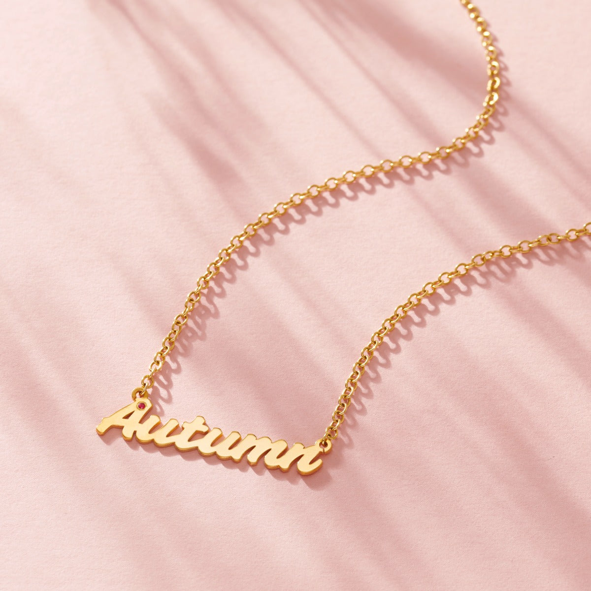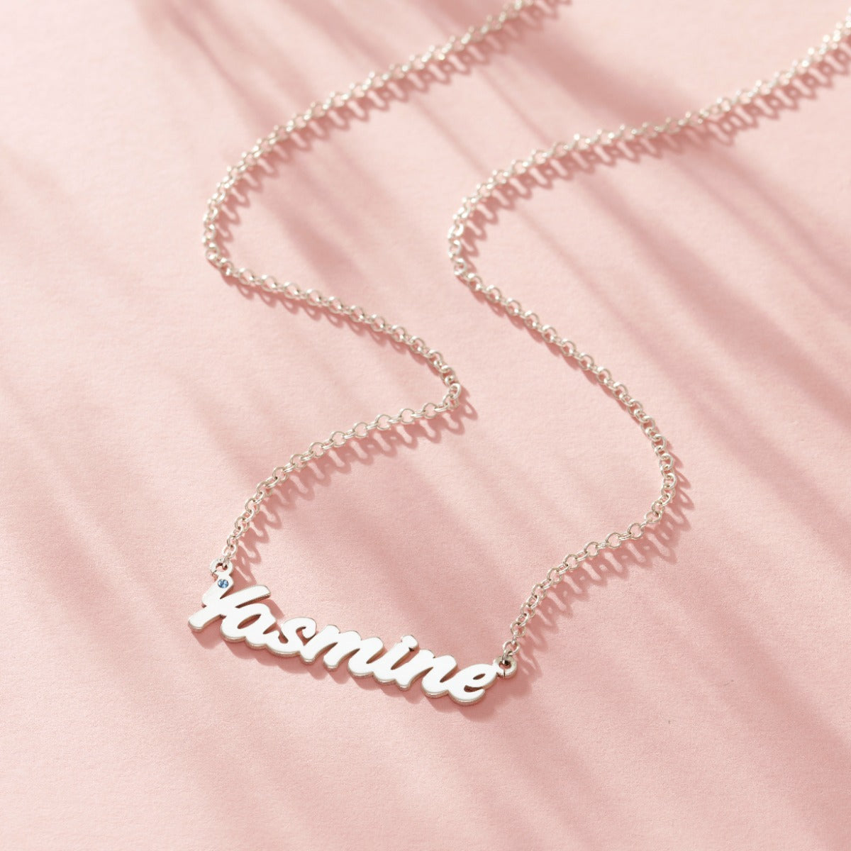 This gorgeous Carrie style necklace is made by our expert jewellers in our Brighton workshop. Your name is cut out of solid sterling silver before we handset your chosen birthstone on the first letter. For a...