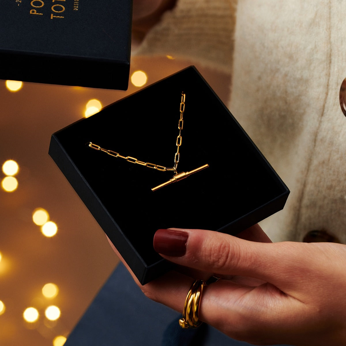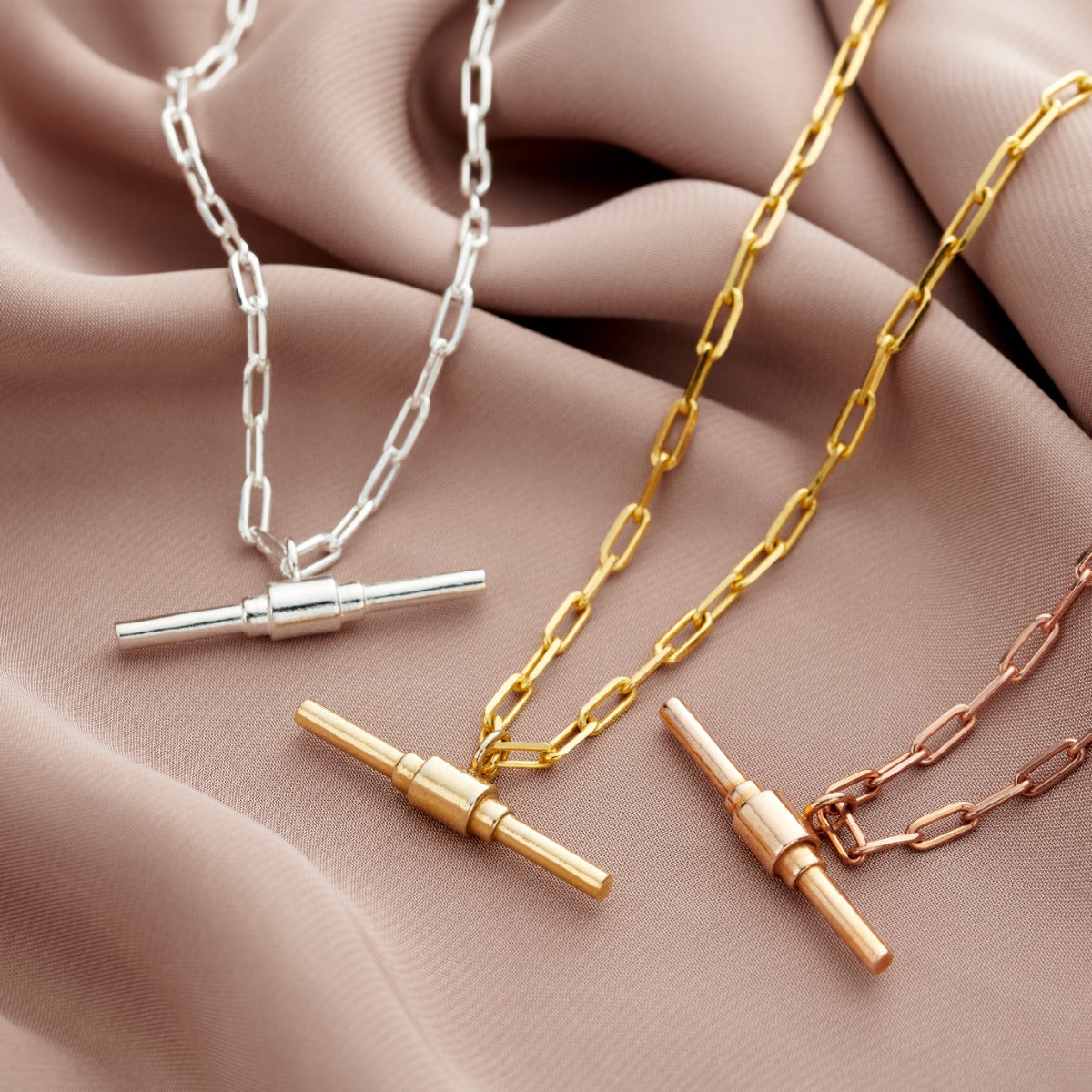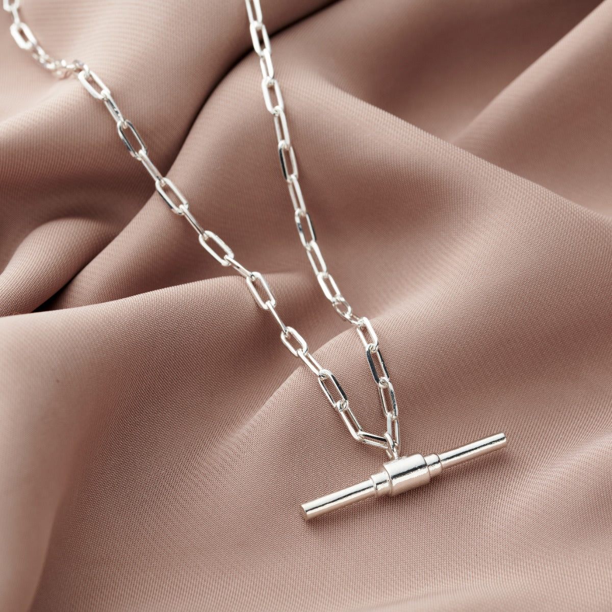 This unique silver necklace combines the classic Albert T Bar necklace with an updated contemporary chain. Made from Sterling Silver each T Bar pendant can be personalised with your initial. For an extra spe...