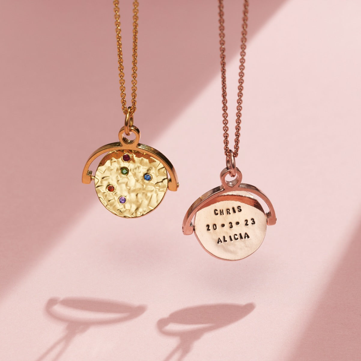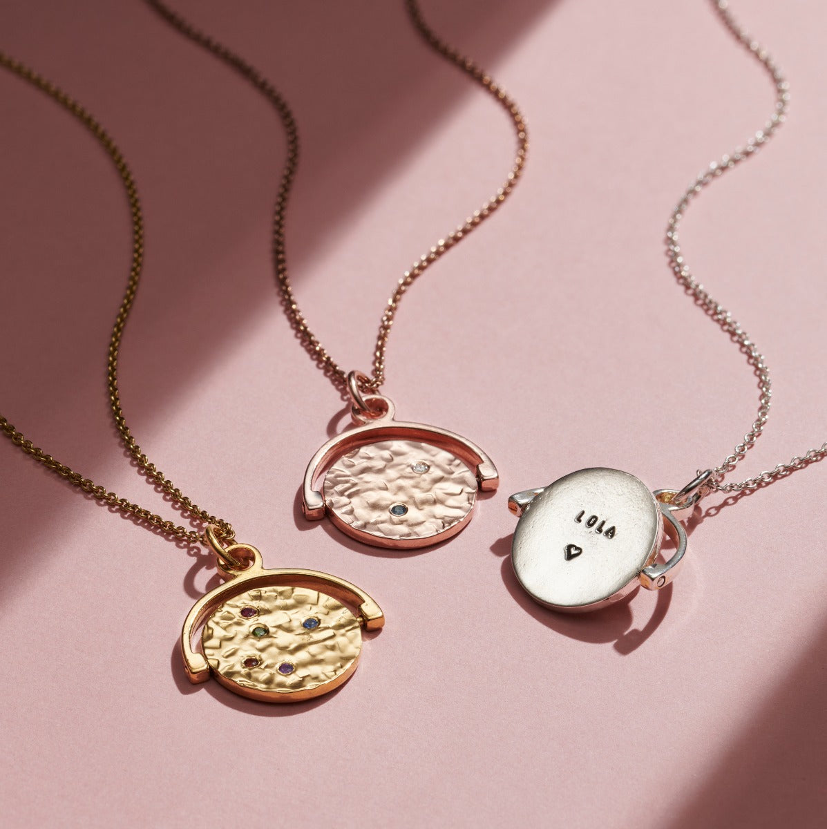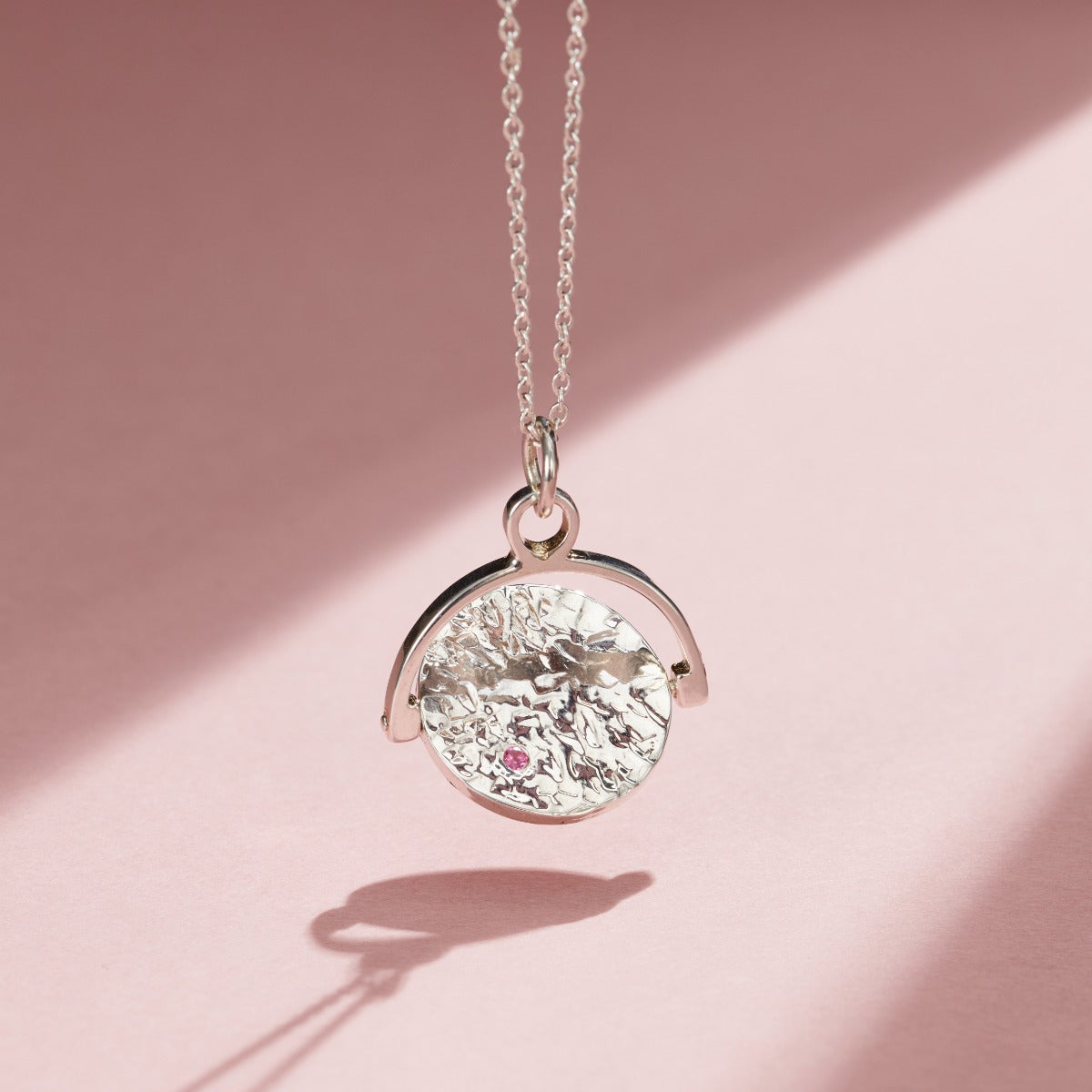 This beautiful spinner necklace is made from sterling silver. This design features our spinning disc pendant which is given a hand-textured finish before being handset with up to 6 of your chosen birthstones...