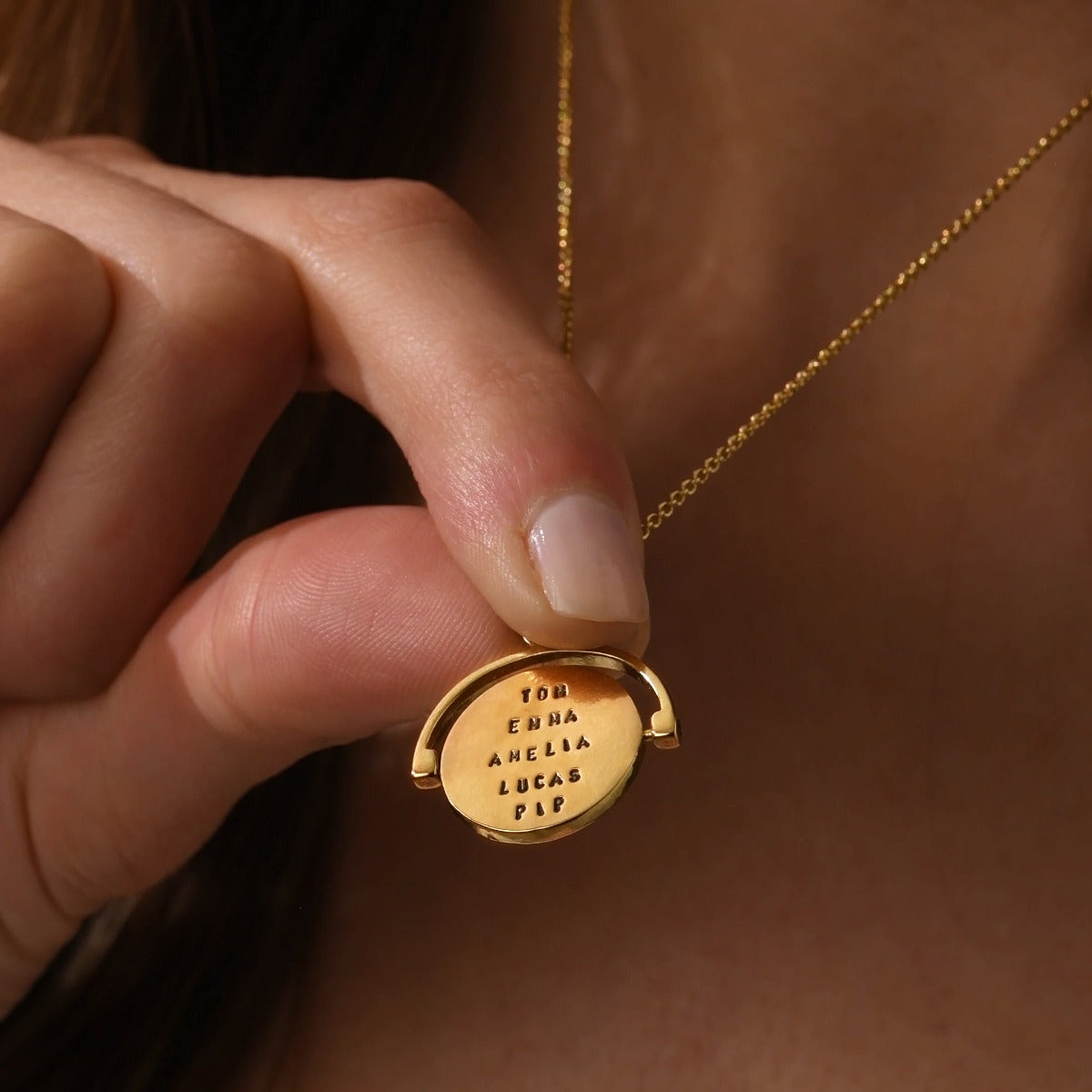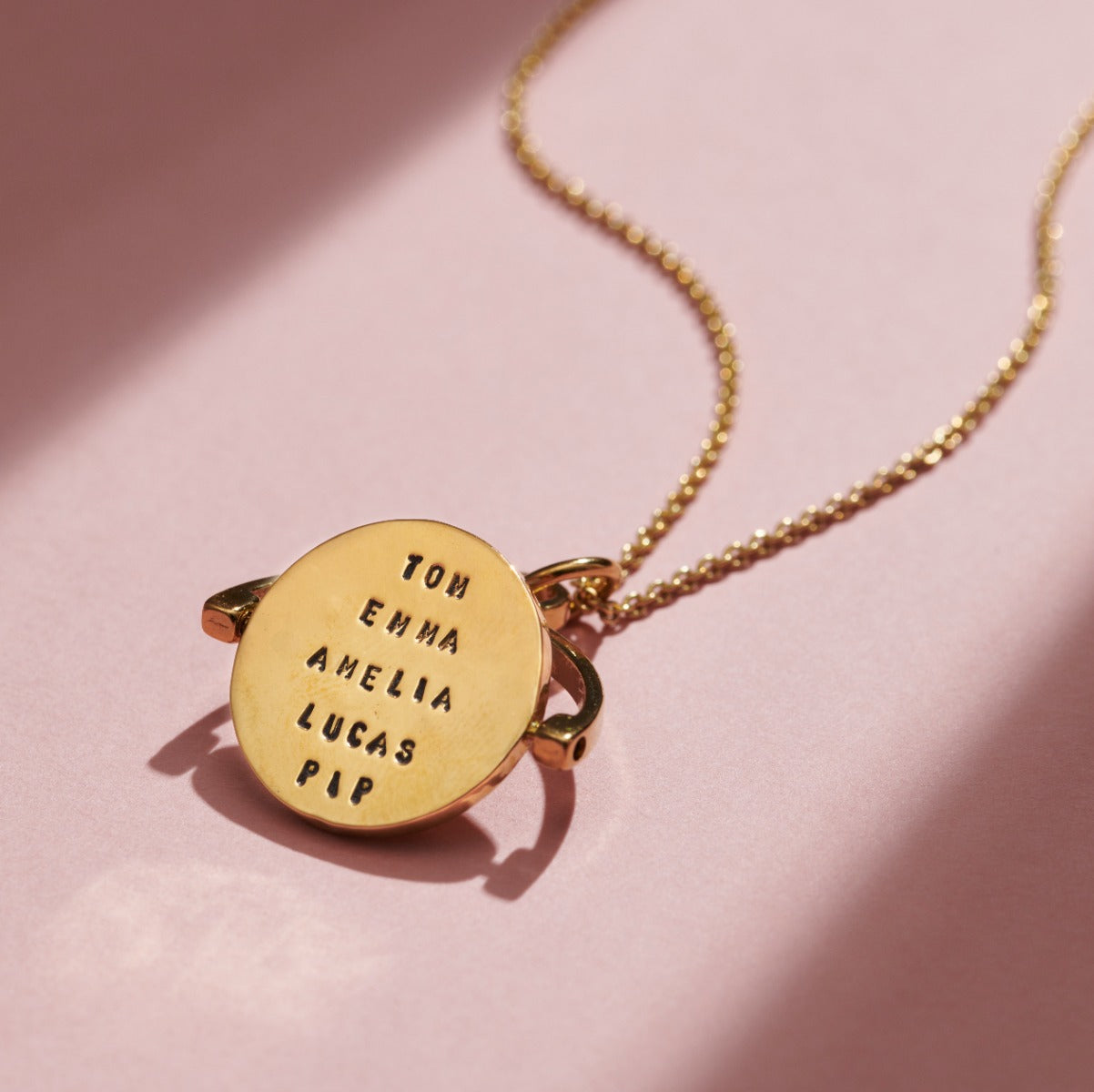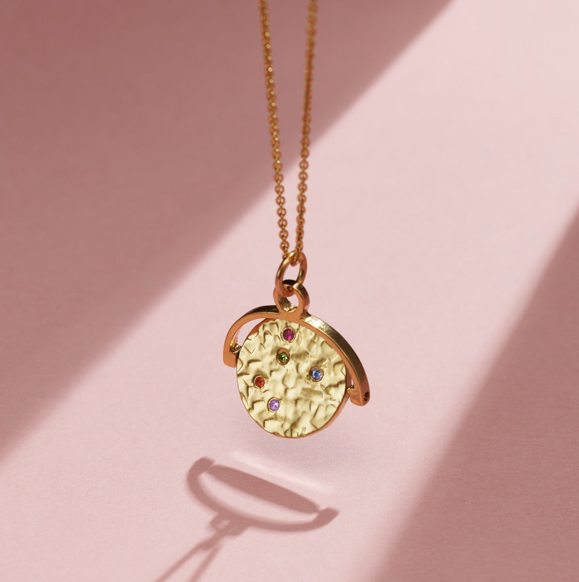 This beautiful spinner necklace is made from sterling silver. This design features our spinning disc pendant which is given a hand-textured finish before being handset with up to 6 of your chosen birthstones...