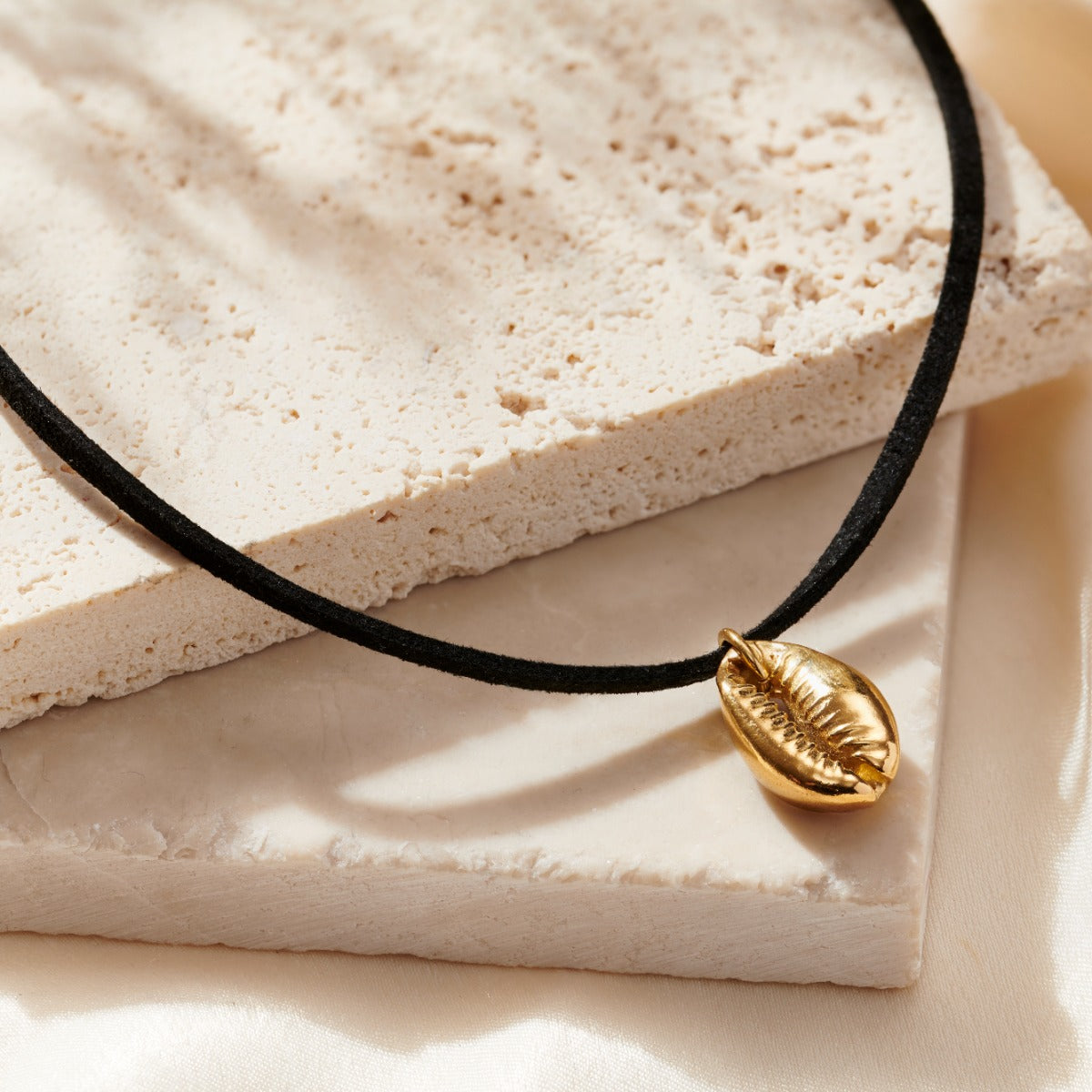 This beautiful necklace is inspired by our love for nature. Featuring our Cowrie shell charm suspended from a faux leather necklace. We love the contrast of the metal and the leather, particularly when the p...