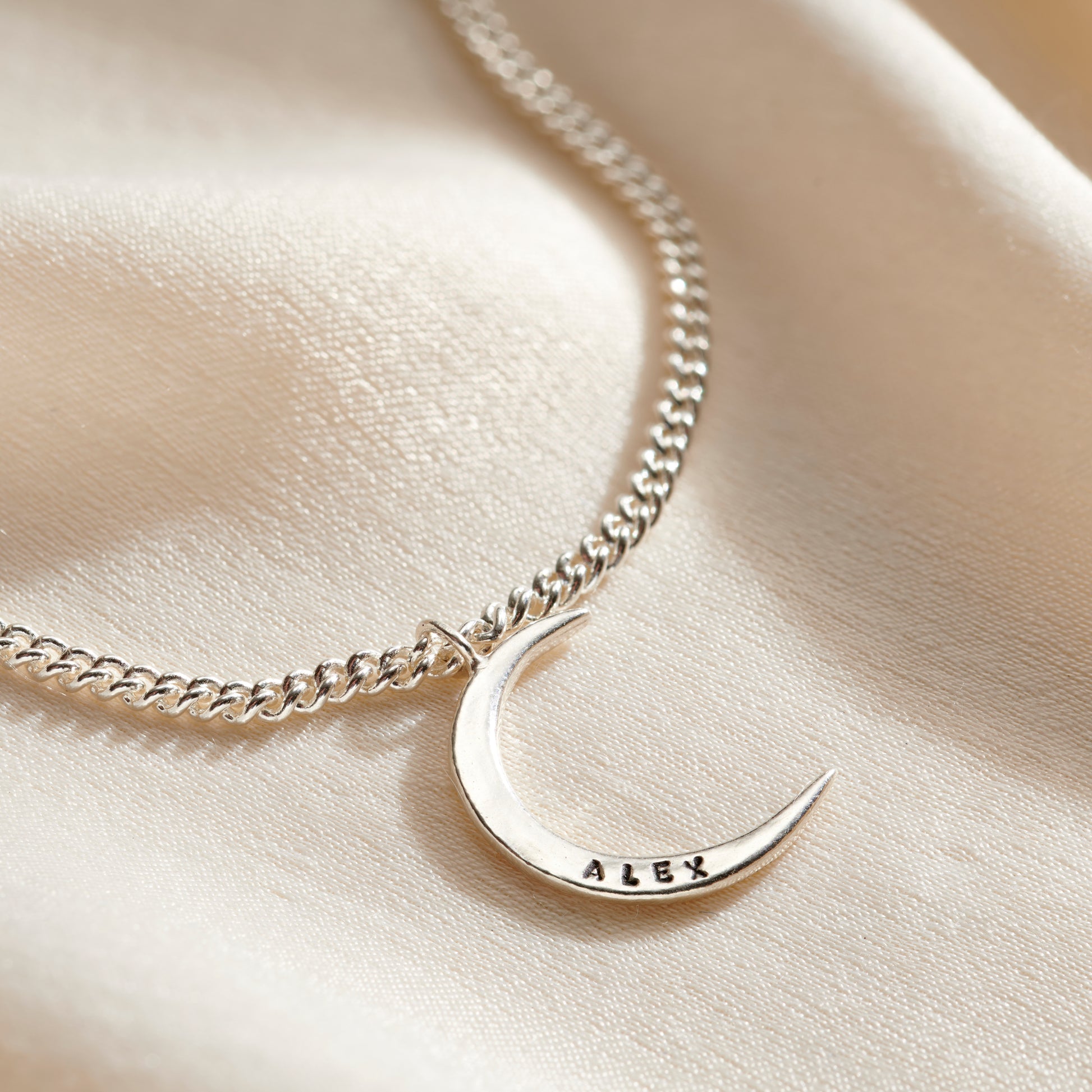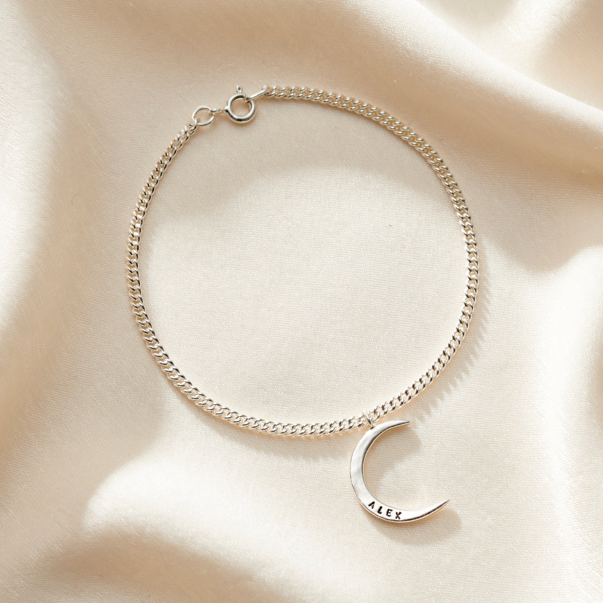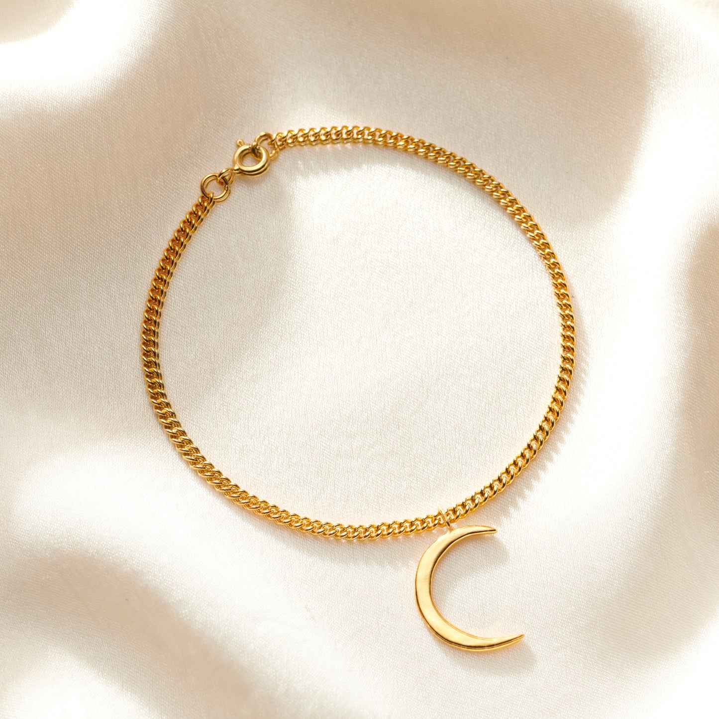 The beautiful Crescent Moon Bracelet adds an elegant touch to any outfit. A delicately slim crescent moon pendant is suspended from a timeless curb chain bracelet. Capturing the moons beauty in a stunning st...