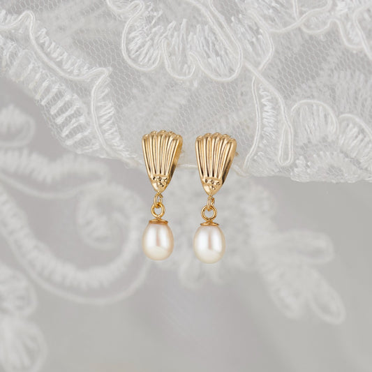 9ct Gold Scallop & Hanging Pearl Stud Earrings