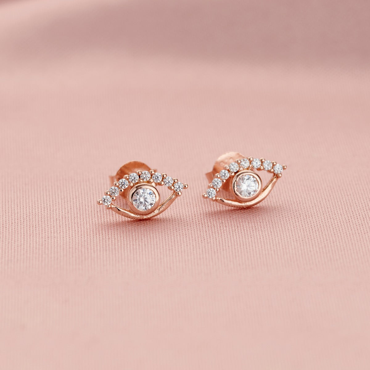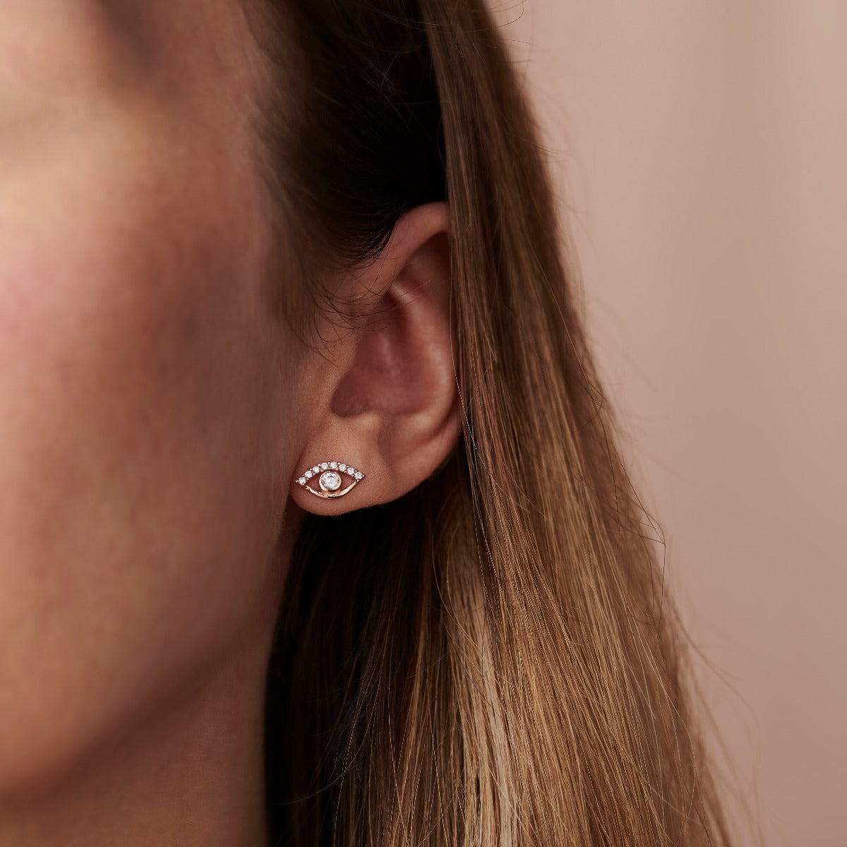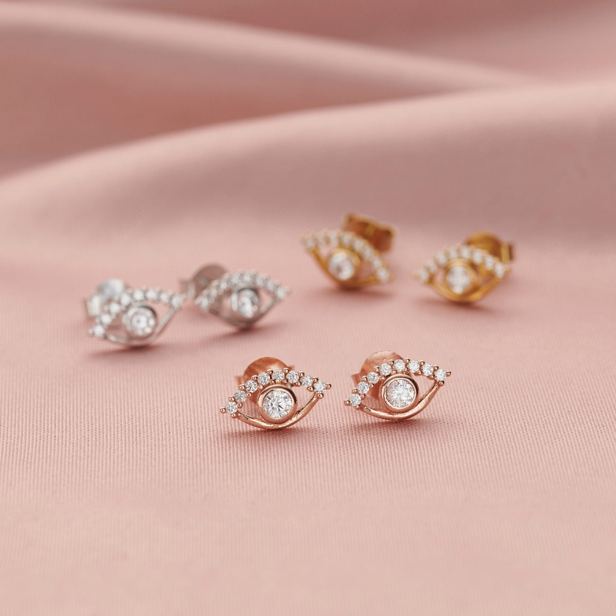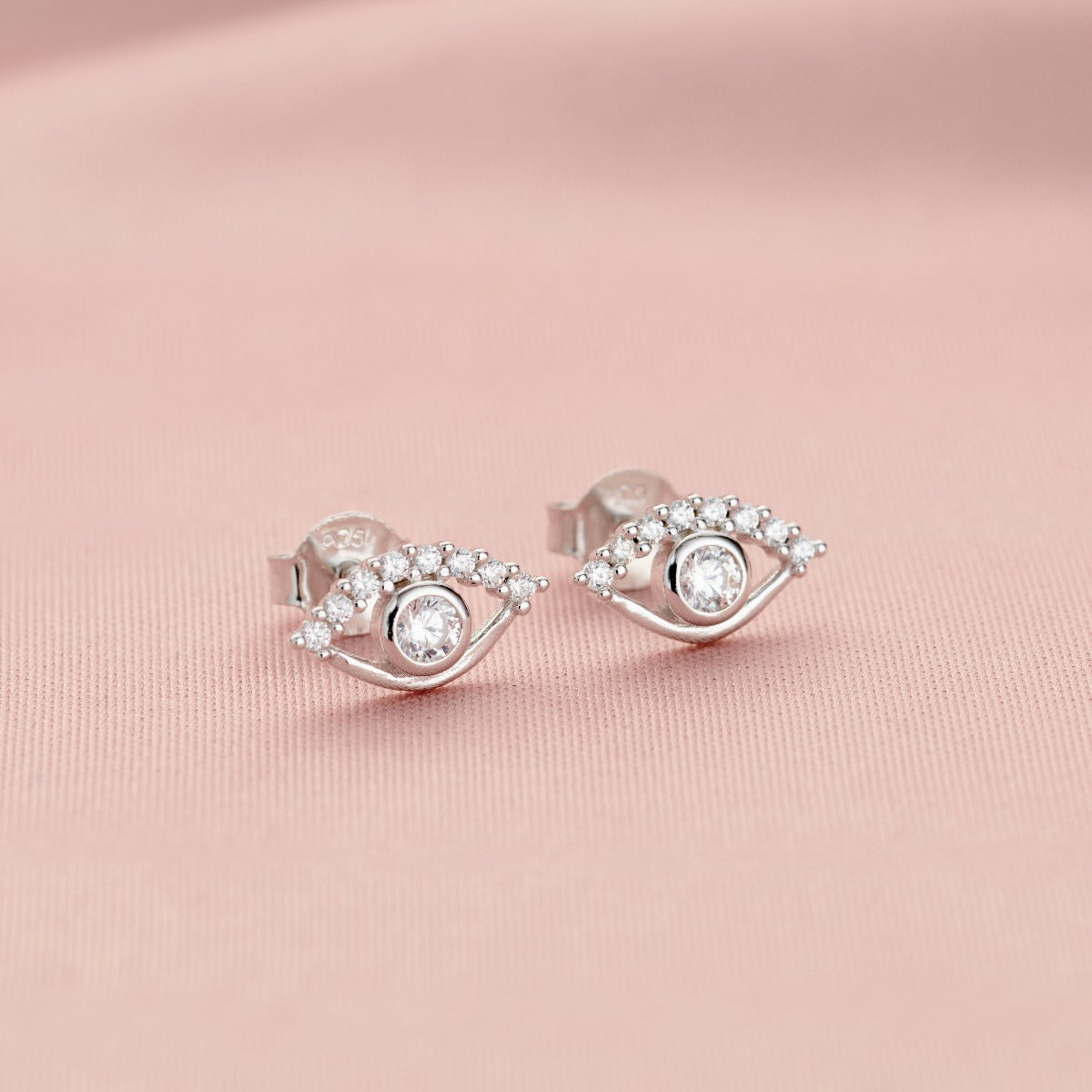 The stunning Cubic Zirconia Evil Eye Stud Earrings are handcrafted in our workshop in Brighton from Sterling silver, with optional 18ct yellow or rose gold plating. Each stud is set with an Evil Eye motif ma...