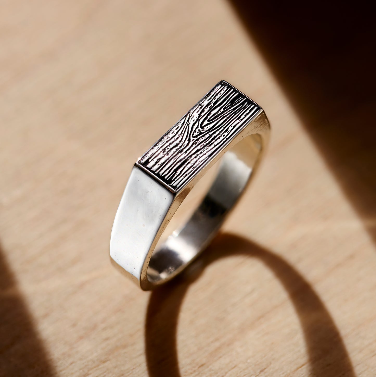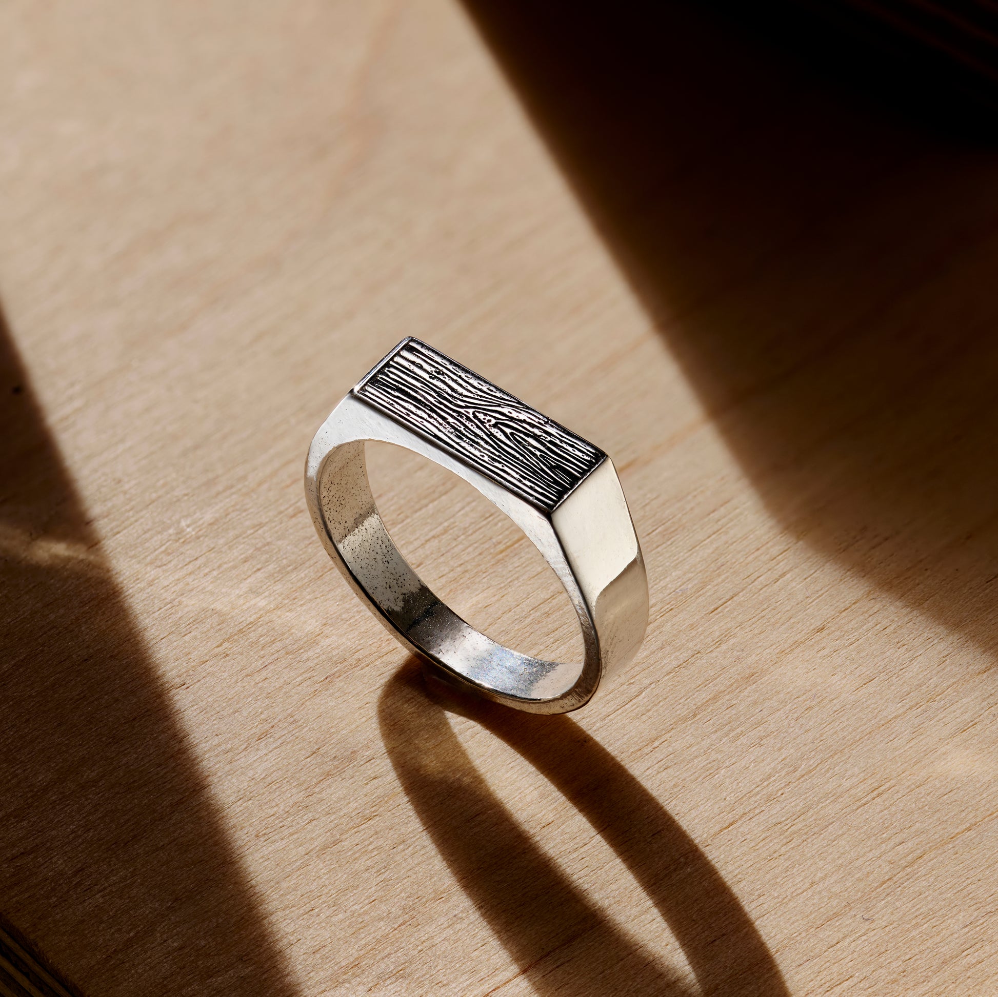 This gorgeous rectangle signet ring is the perfect gift for those who love nature. Made from sterling silver the ring face is engraved with a unique wood grain texture. The texture is given a darker infill t...