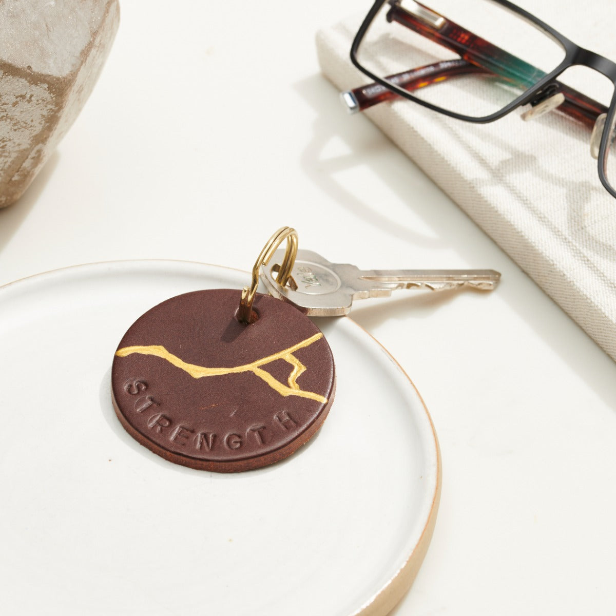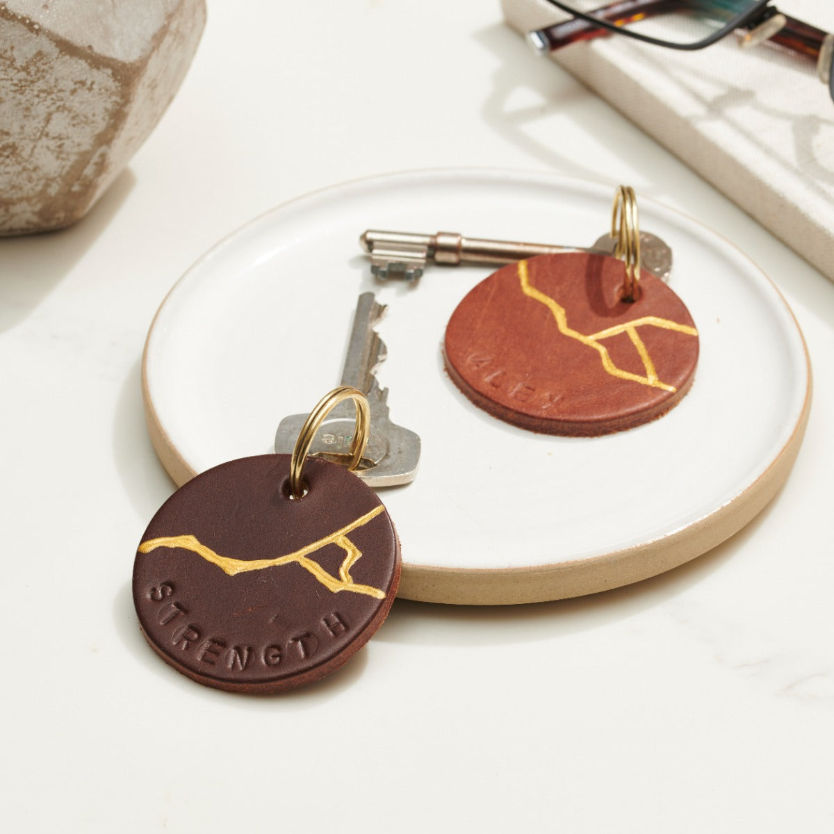 This personalised keyring is cut from genuine leather. Each keyring is then finished with a unique Kintsugi-inspired detail. We can then personalise your leather keyring with your meaningful words, such as a...