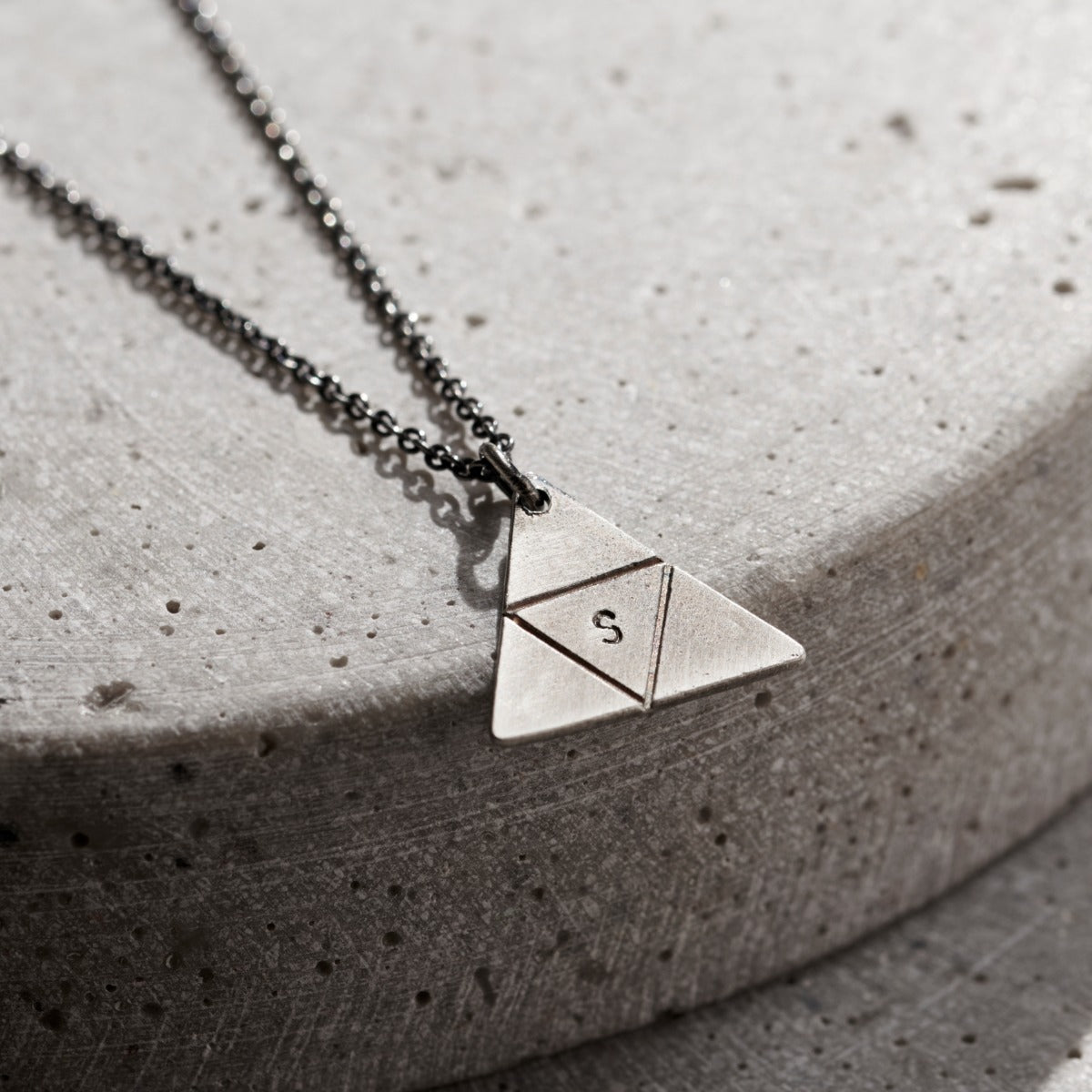 This unique personalised men's necklace is made from beautiful sterling silver. Featuring a triangular pendant which can be personalised with your initial. Our jewellers hand-stamp your chosen personalisatio...