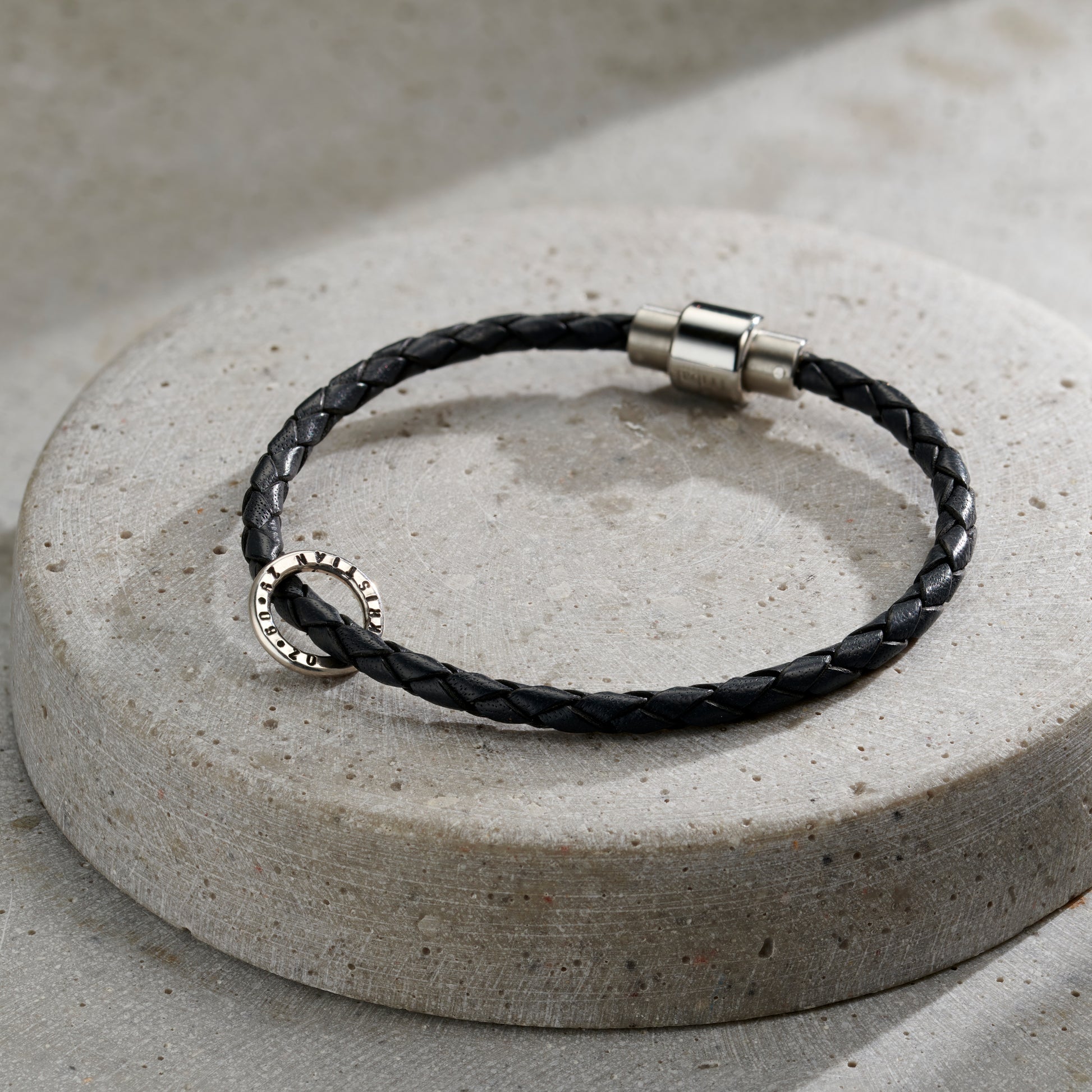 This popular personalised men's bracelet is made from leather and finished with a magnetic steel clasp. The bracelet is adorned with up to three of our mini-messag...