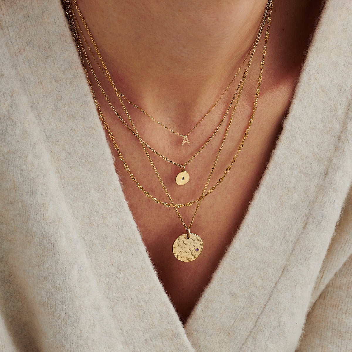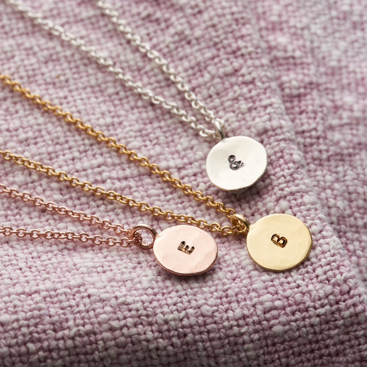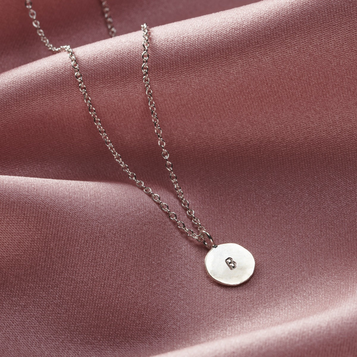 Made from solid sterling silver, this stunning necklace features a mini disc pendant which is hammered by hand to create a unique finish. Our jewellers then personalise the disc charm with a letter or initia...
