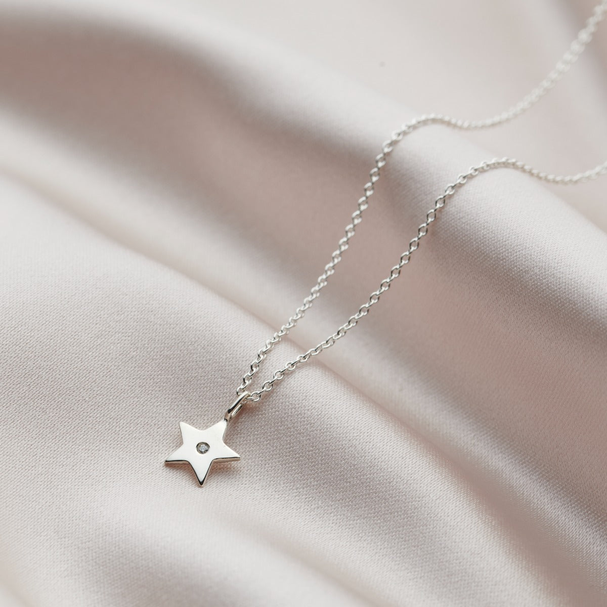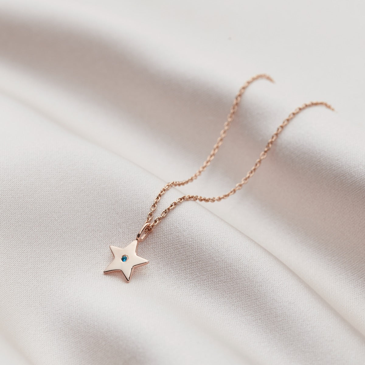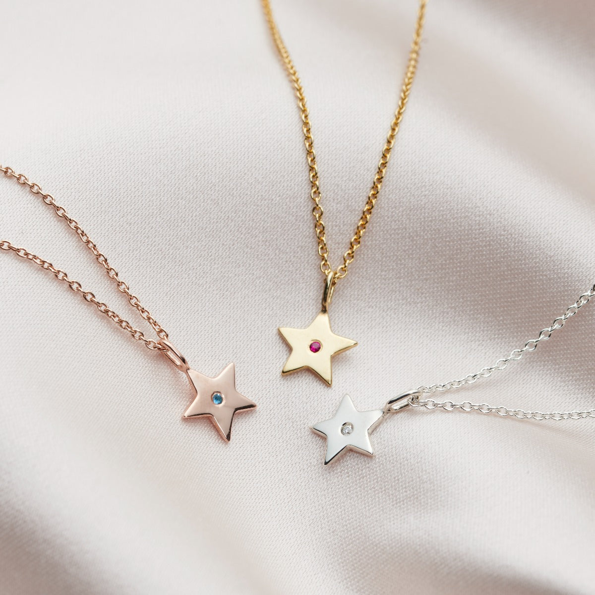 This beautiful star charm necklace is made in our Brighton workshop from Sterling Silver. Our jewellers handset your chosen birthstone into the centre of the star pendant which is then suspended from a stunn...