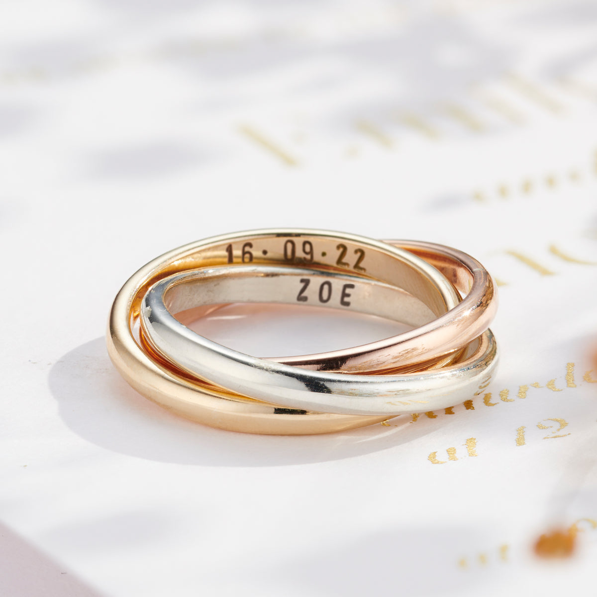 Stunning 9ct gold Russian script ring handmade by our jewellers in our Brighton workshop. Each ring is formed of three individual bands, each made from a different colour of gold before being interlinked. Th...