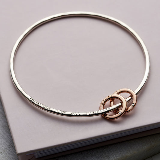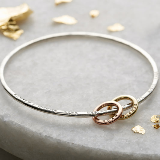 The perfect wedding day gift or finishing touch for her bridal outfit. Our beautiful Personalised 9ct Gold Heart Bangle is handcrafted from fine sterling silver with solid 9ct gold heart charms that move fre...
