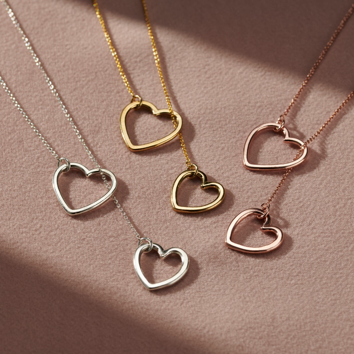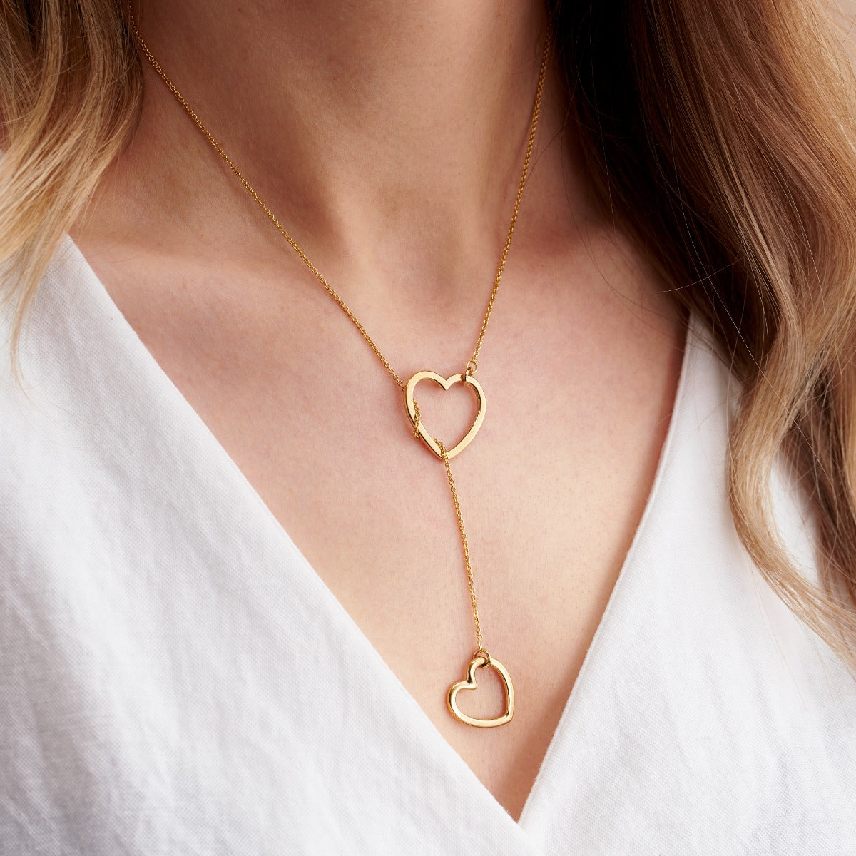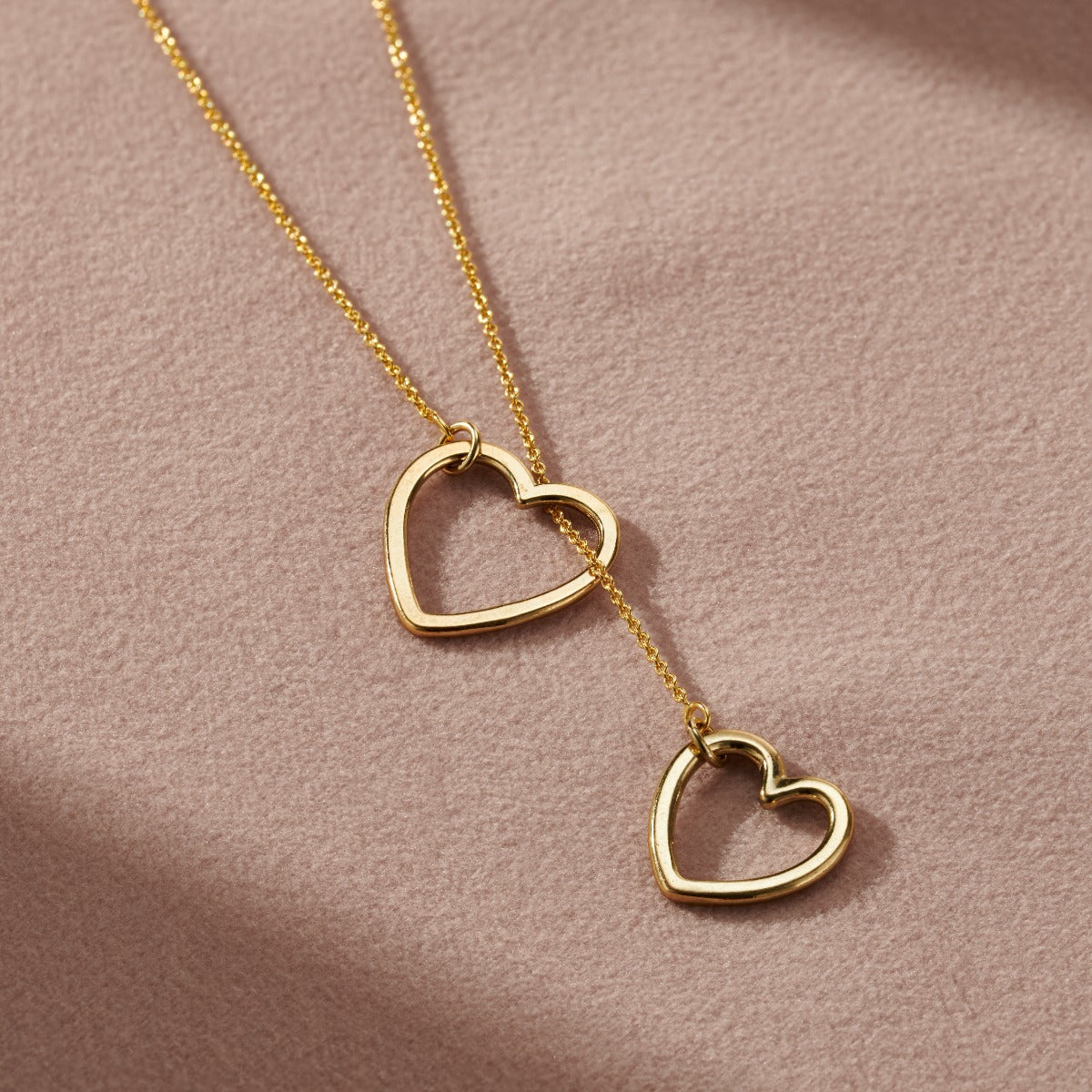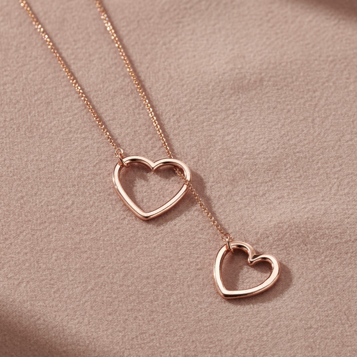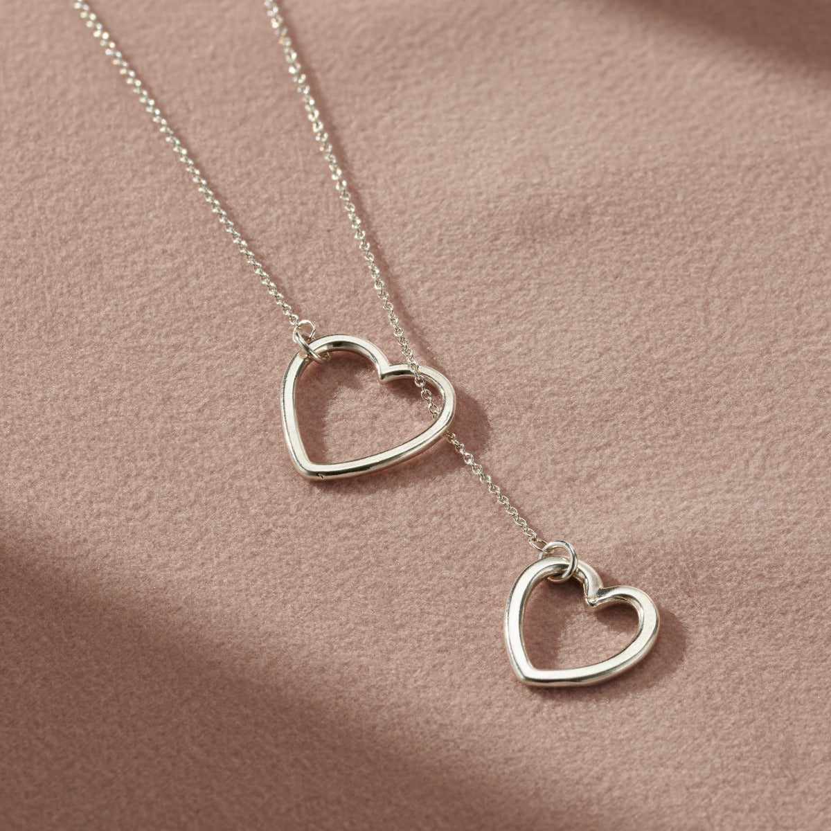This beautiful lariat necklace is handmade by our jewellers from Sterling Silver. A dainty clasp free trace chain is finished with a heart charm on either end. The two hearts are different sizes and when the...