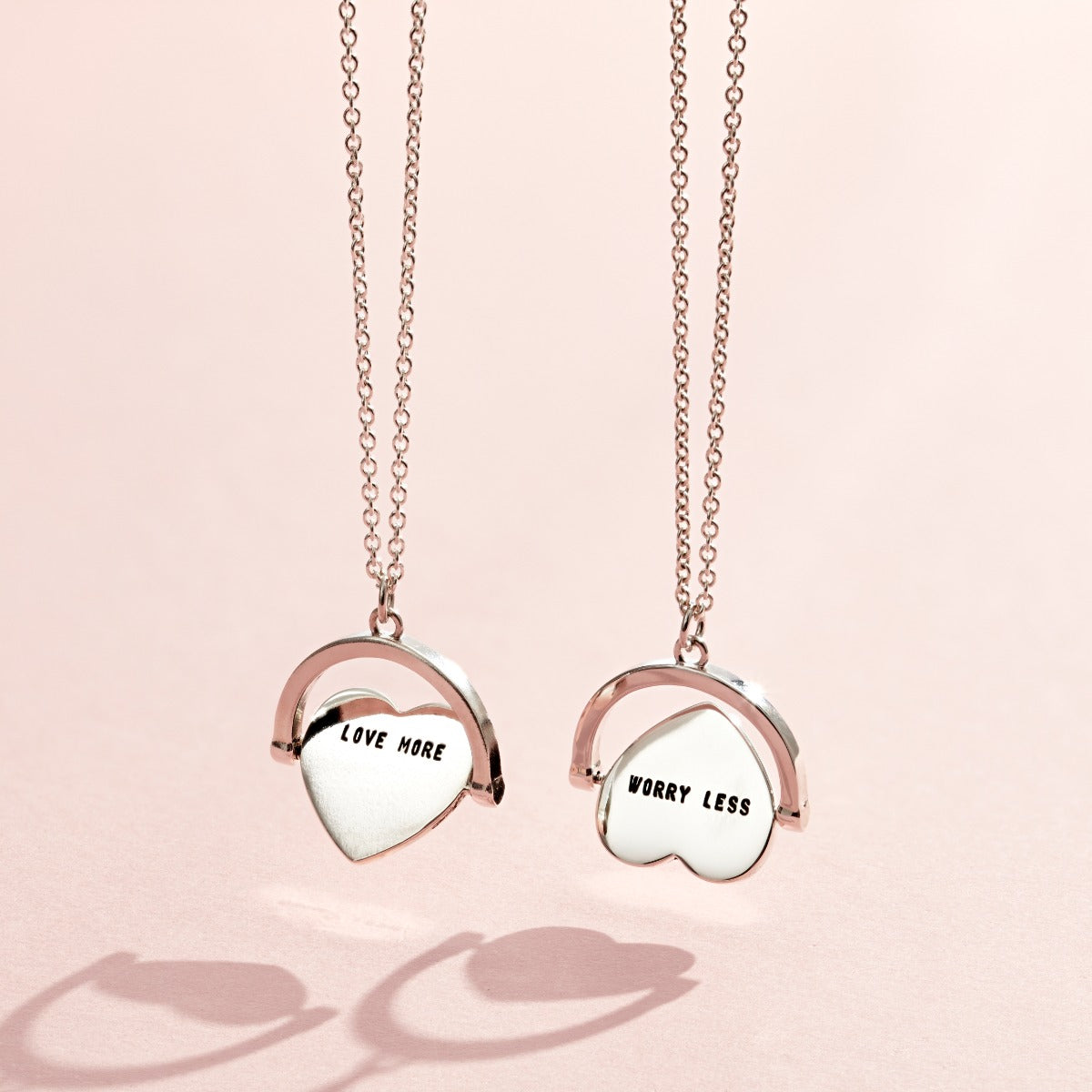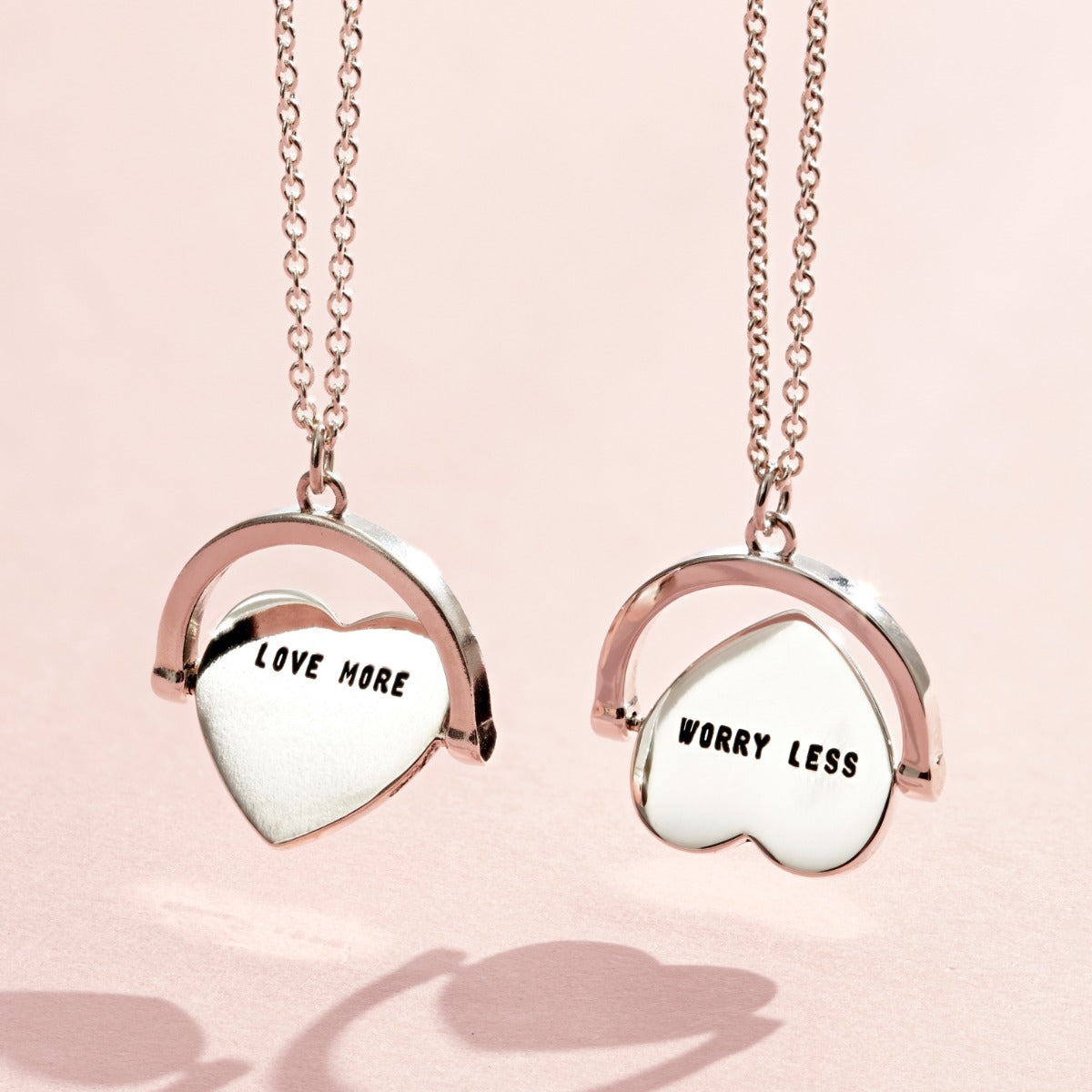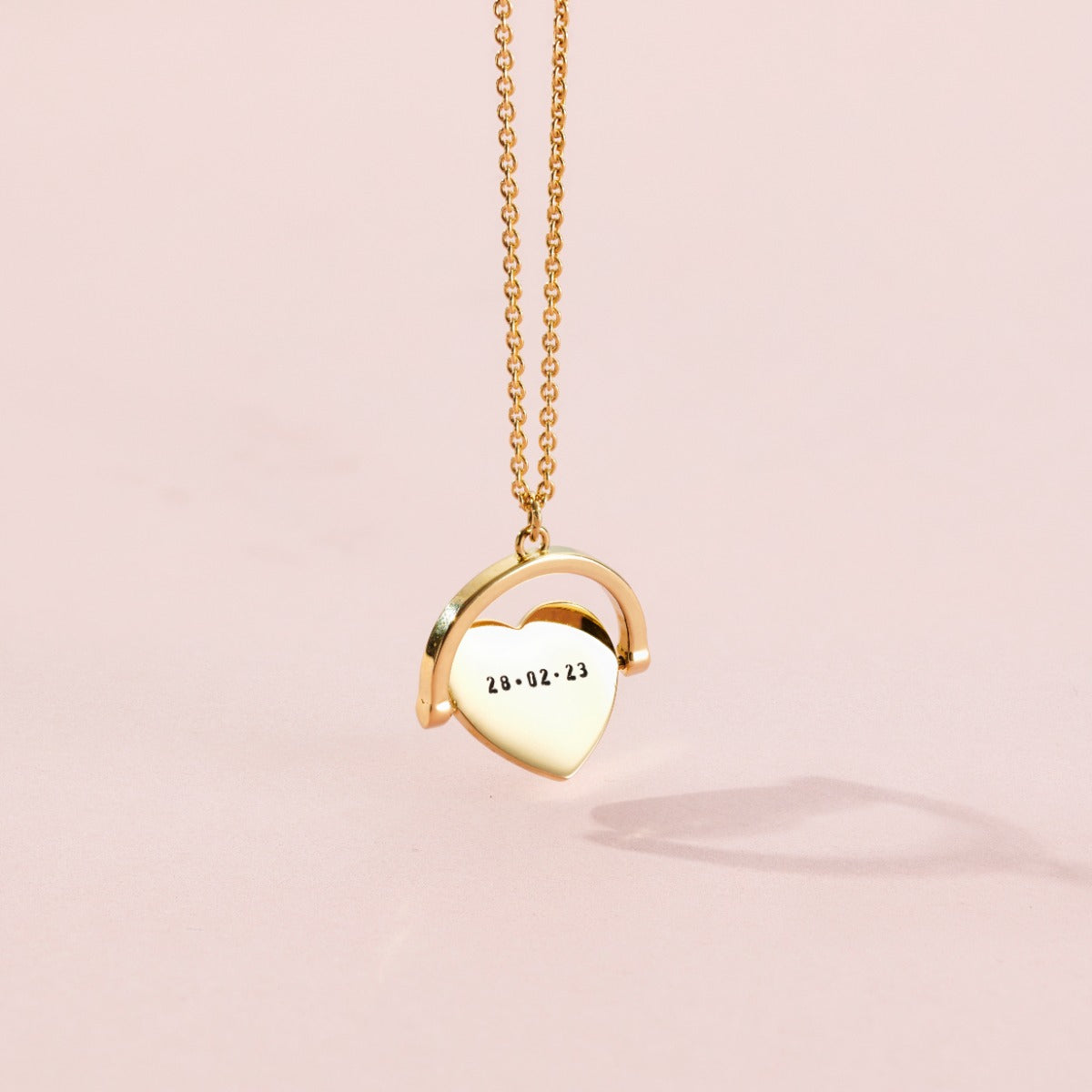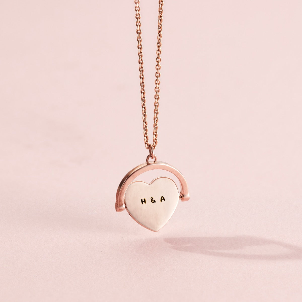 This gorgeous necklace is made from Sterling Silver. The design features a spinning heart pendant suspended from one of our classic silver trace chains. Each side of the heart can be hand stamped with your c...