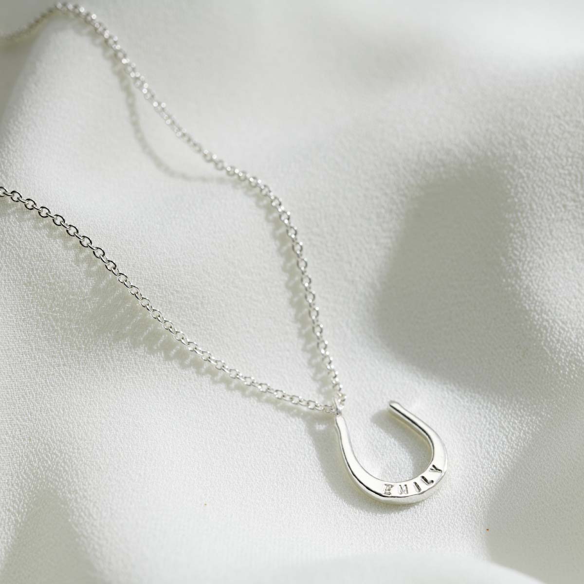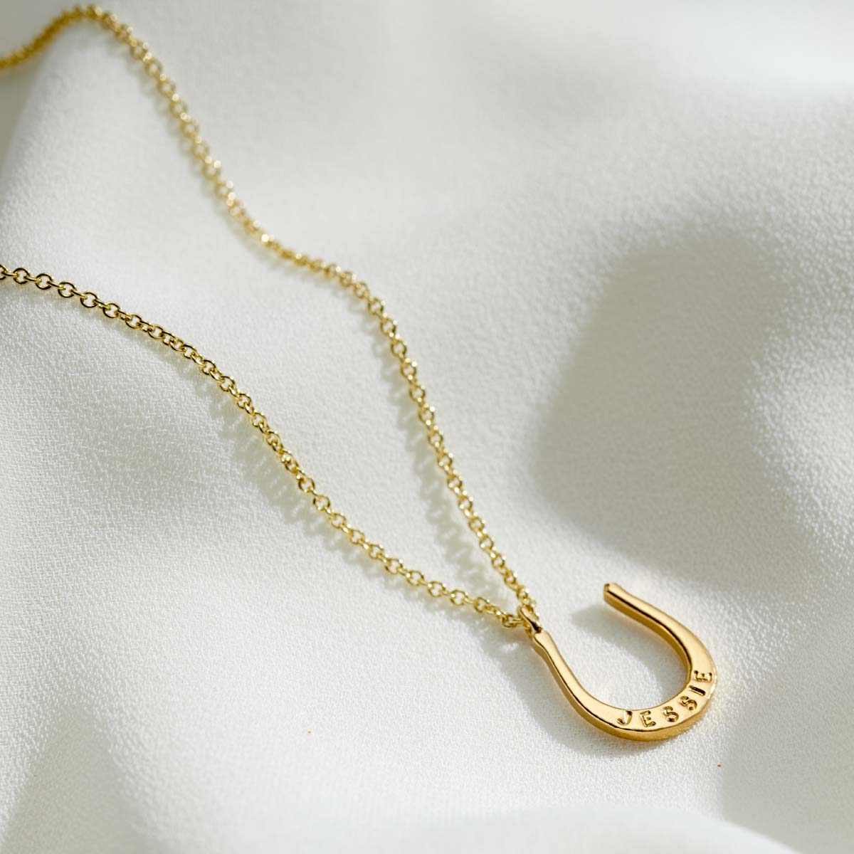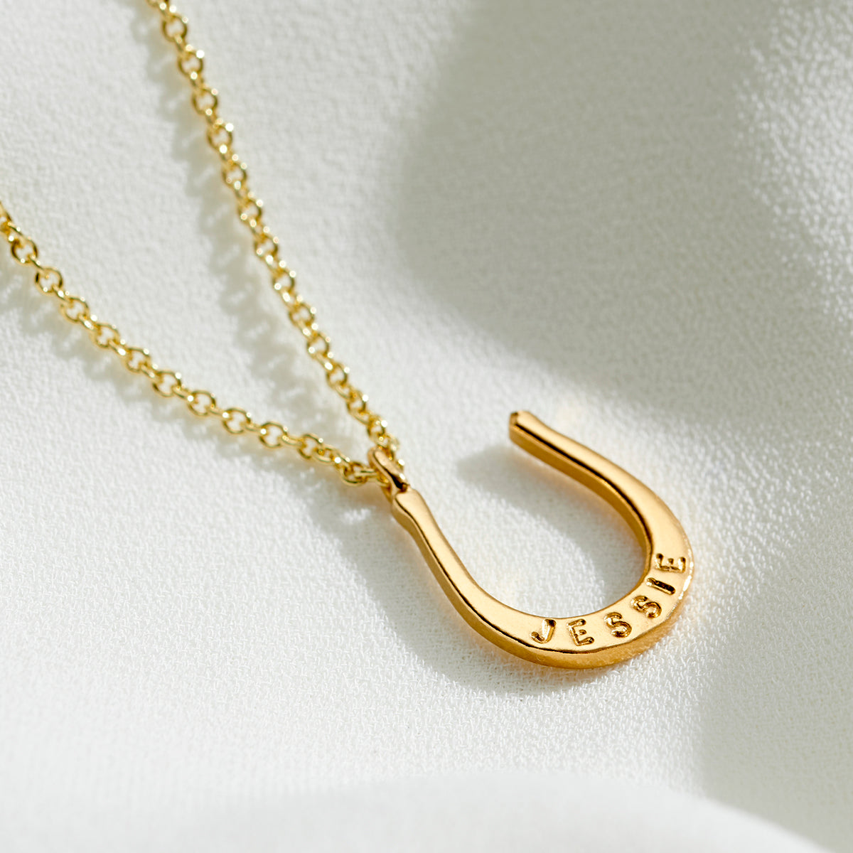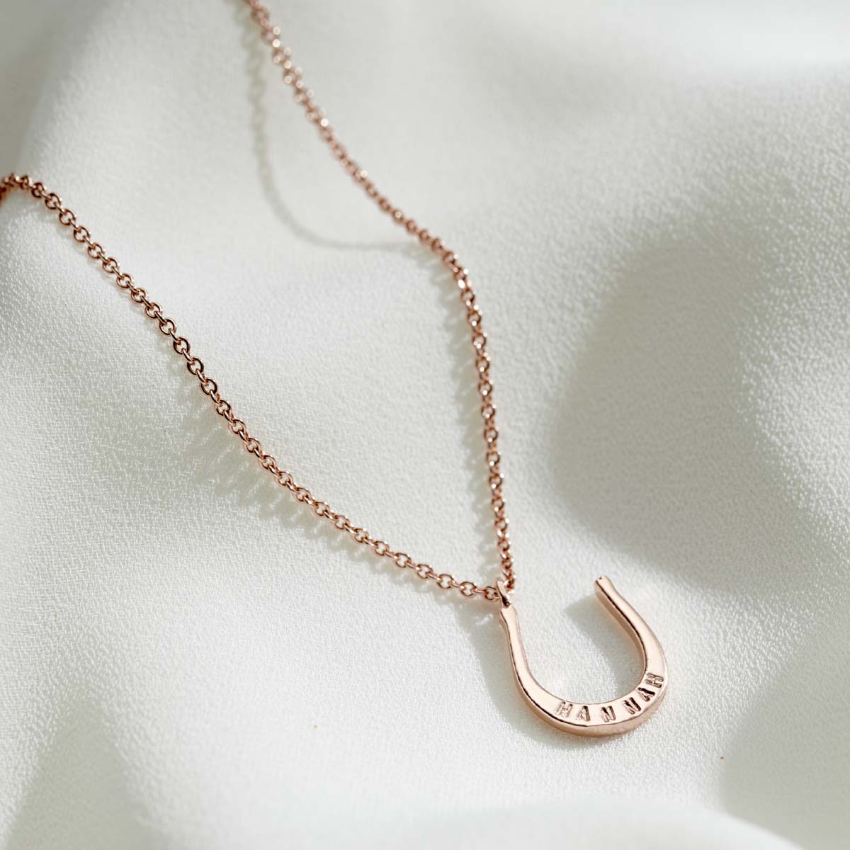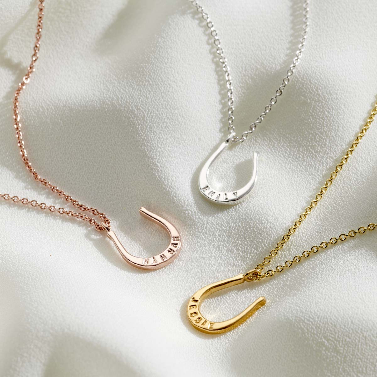The lovely Personalised Horseshoe Necklace is handcrafted in our Brighton workshop from solid sterling silver, with optional 18ct rose or 18ct yellow gold plating. Carry a little good luck with you or give t...