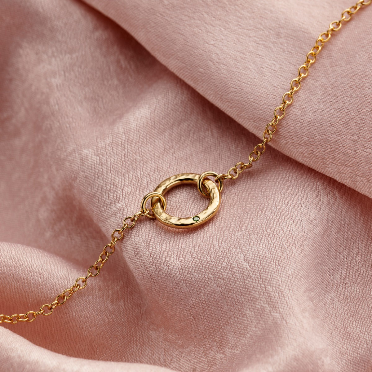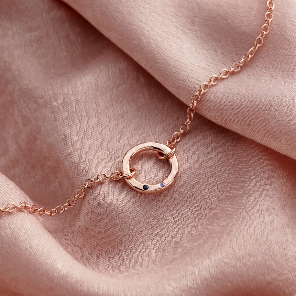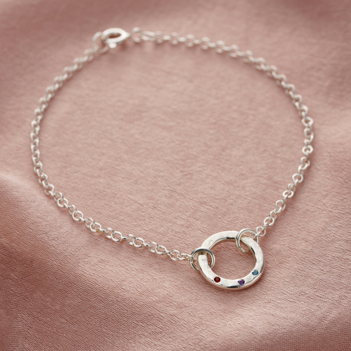 This beautiful personalised bracelet is handmade from stunning Sterling Silver. This design features our popular mini message ring with a unique textured finish and your chosen birthstone handset into the fa...