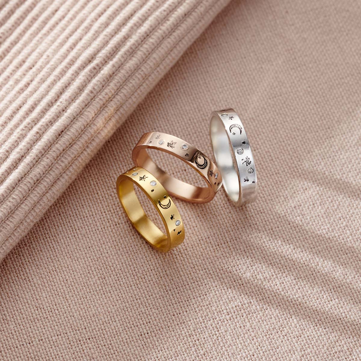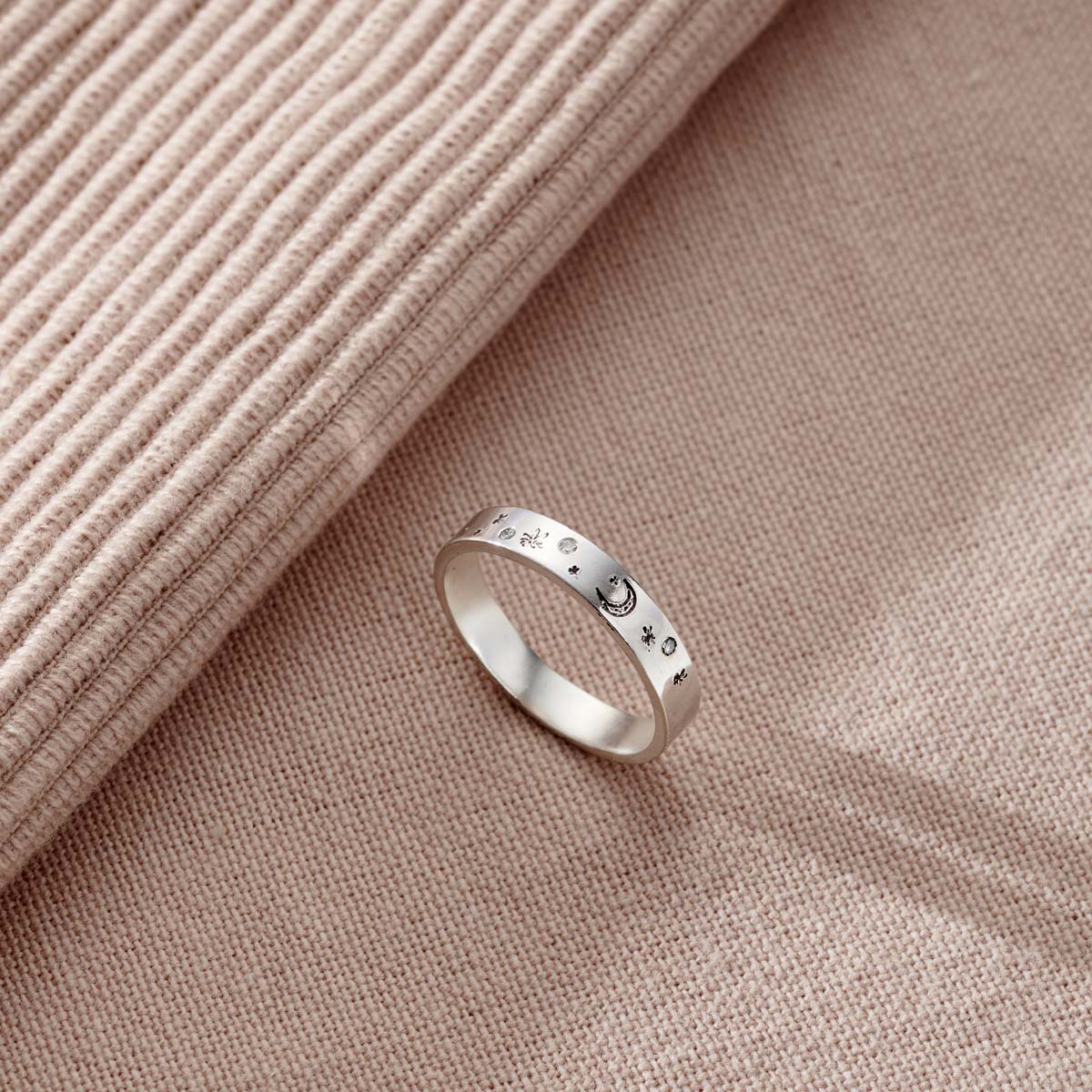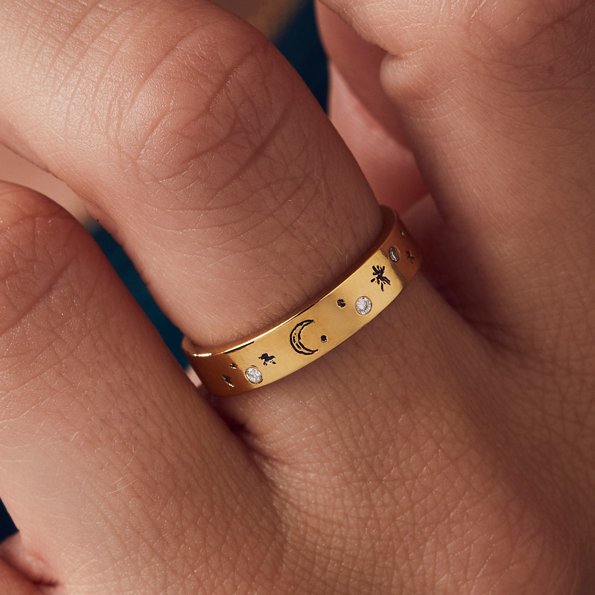 This heavenly ring features a band dotted with diamonds that highlight the simple hand-drawn crescent moon and starburst shapes. This ring will make you want to wear your diamonds every day, and why not? Sta...