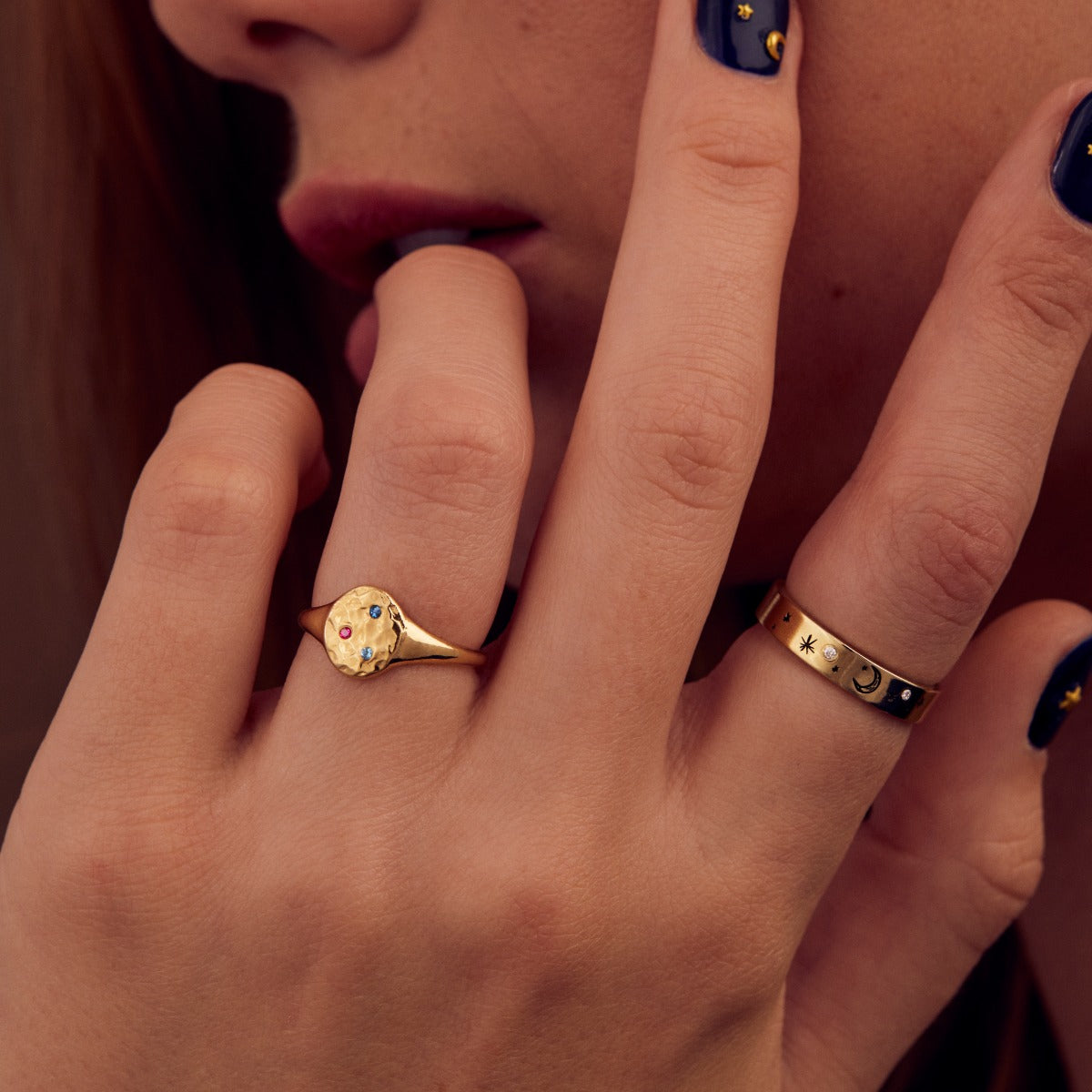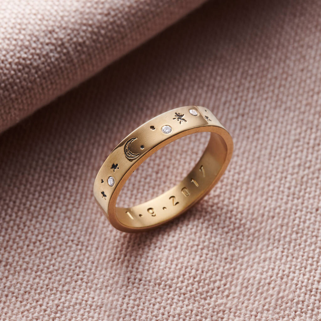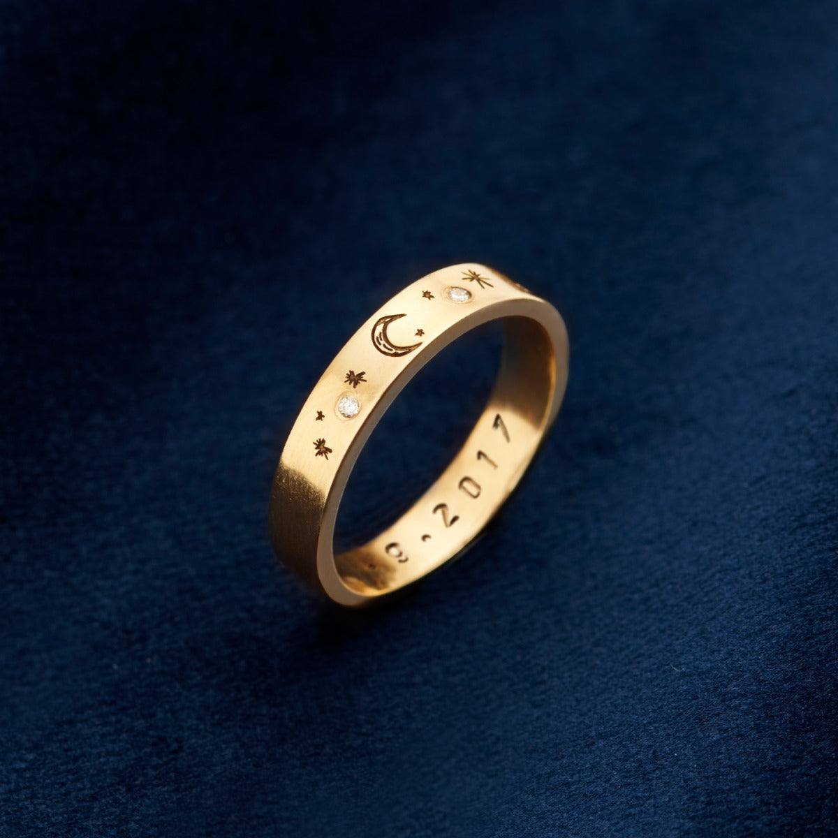 This heavenly ring features a band dotted with diamonds that highlight the simple hand-drawn crescent moon and starburst shapes. This ring will make you want to wear your diamonds every day, and why not? Sta...