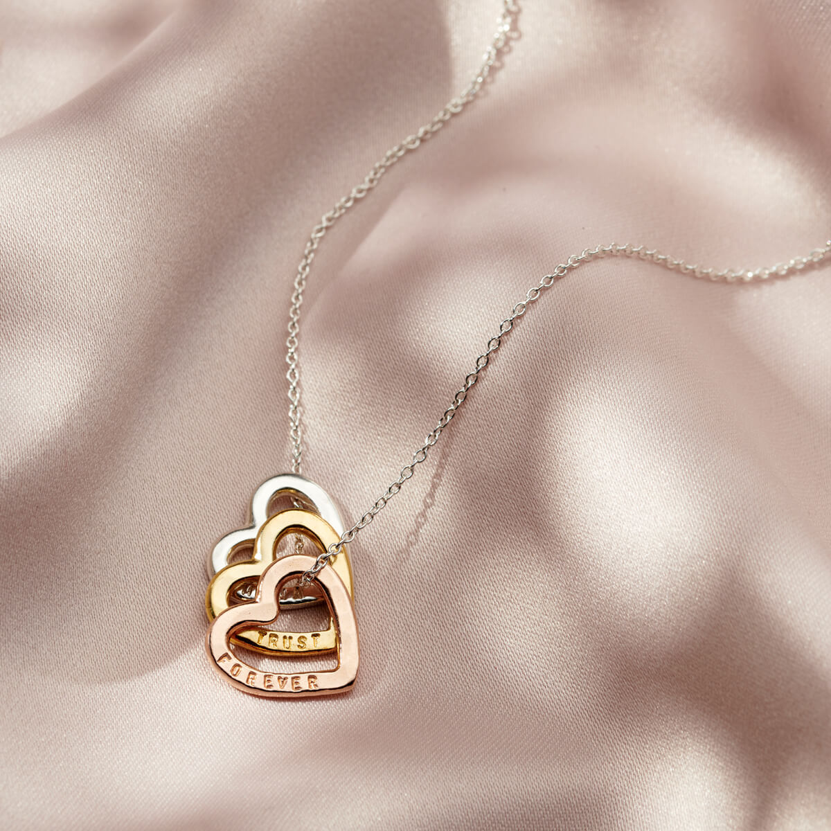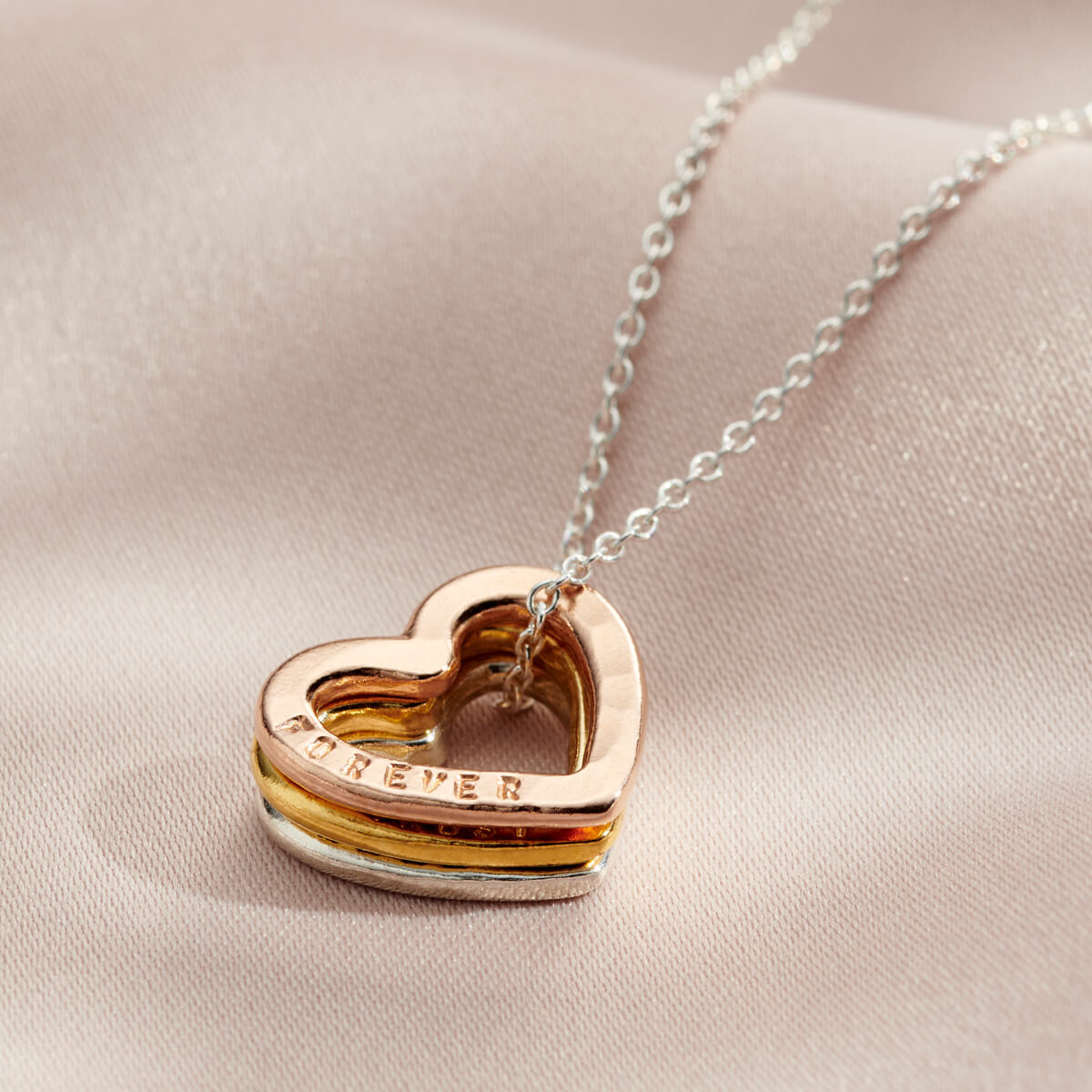 The gorgeous Personalised Tricolore Love Necklace is delicate, contemporary and stylish. Each necklace is individually handcrafted to order from sterling silver, with 18ct rose gold and 18ct yellow gold plat...