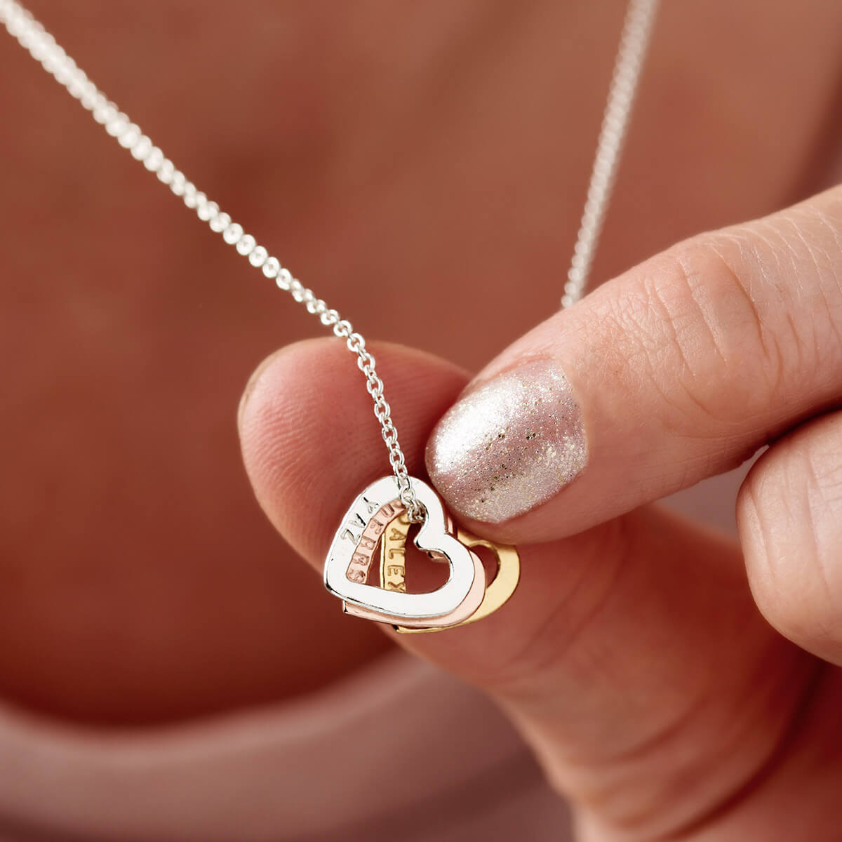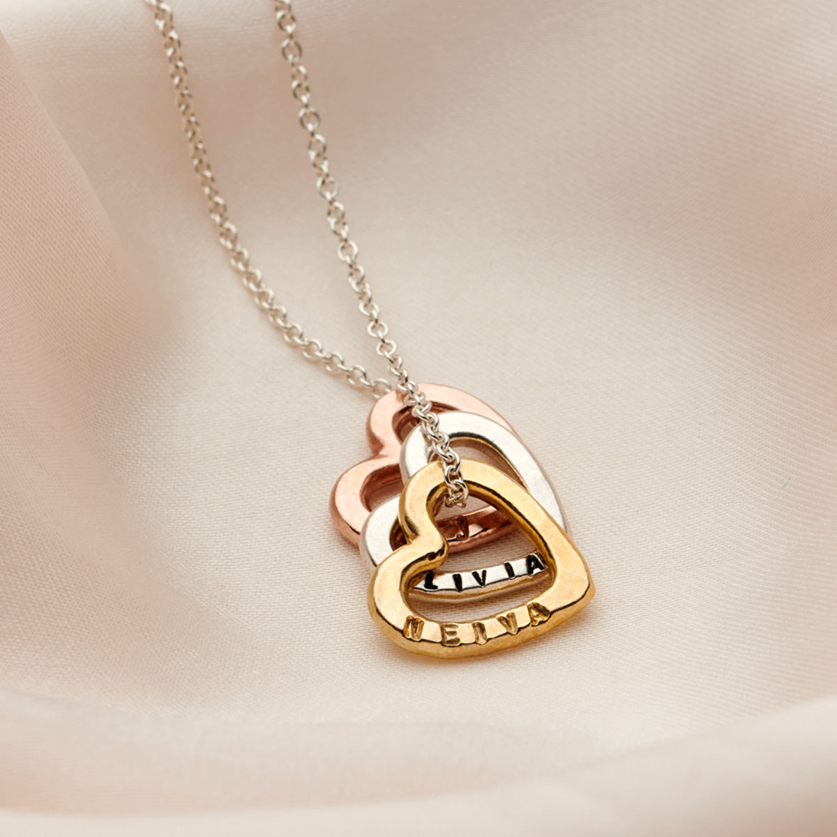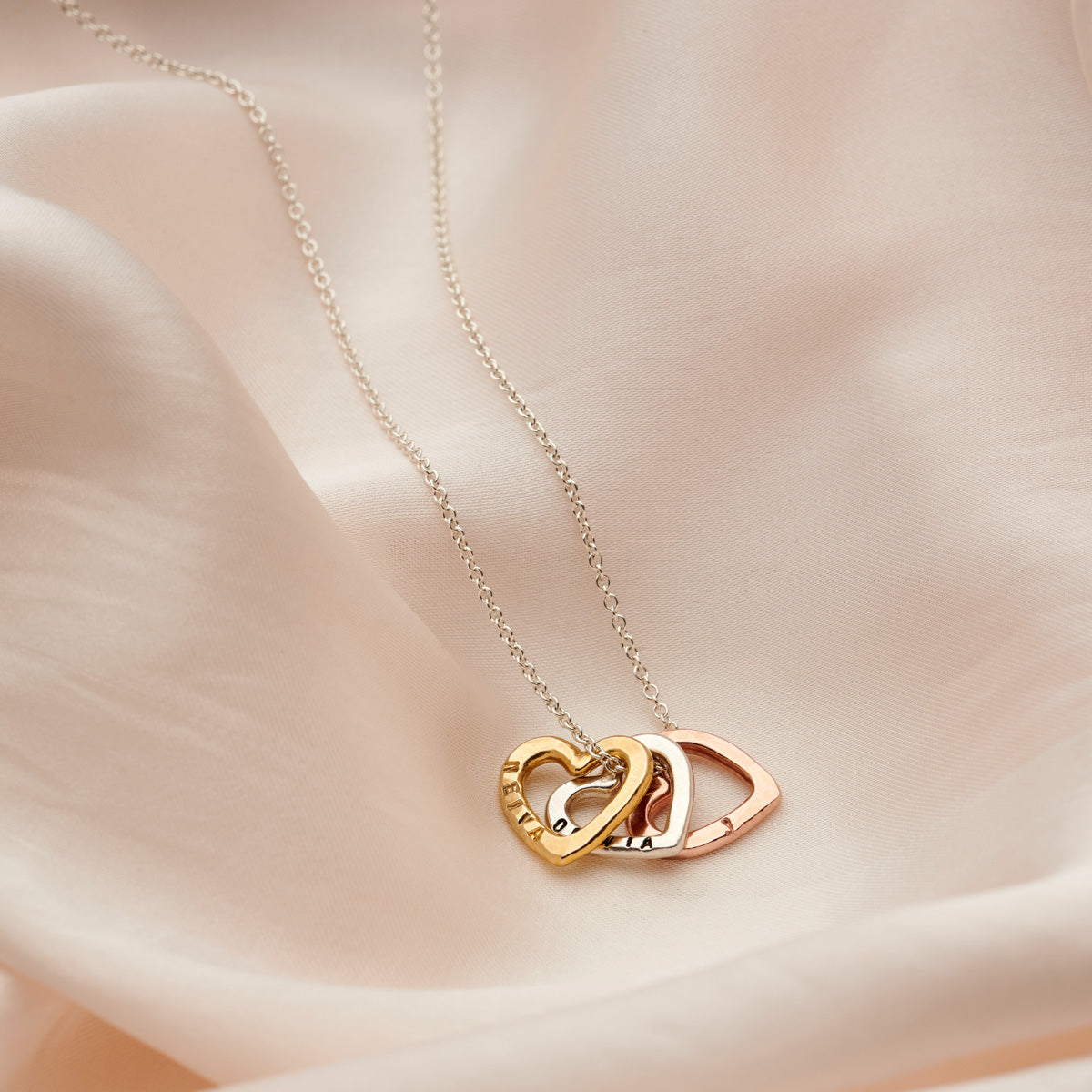 The beautiful Personalised Tricolore Mini Message Heart Necklace is handcrafted to order in our Brighton workshop. The necklace features three dainty mini heart charms suspended from an extra fine trace chai...