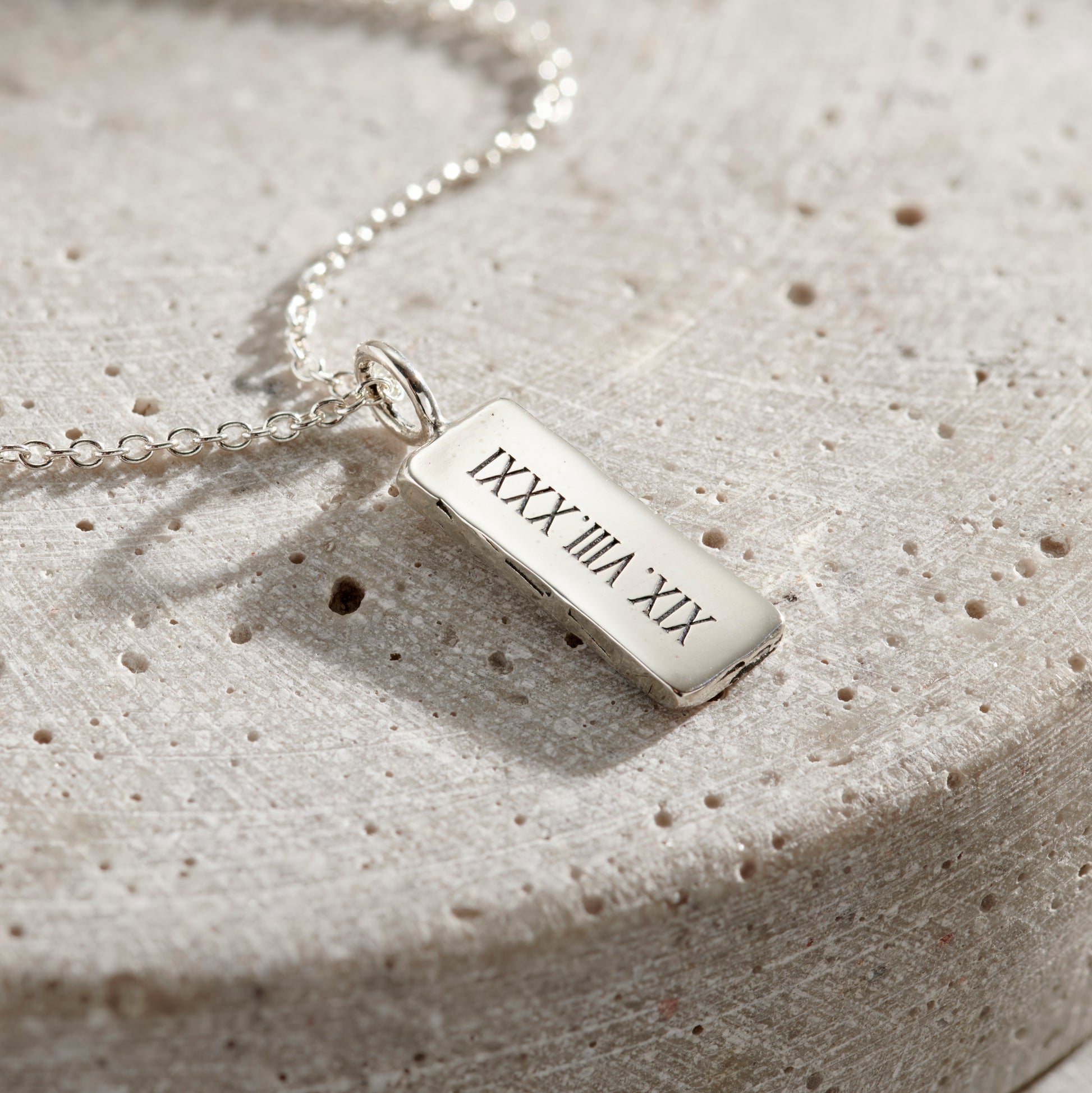 This necklace features our classic rectangular pendant in polished Sterling Silver. Engraved with your choice of Roman numerals across the back. The Roman numerals are a timeless and classic look. Have...