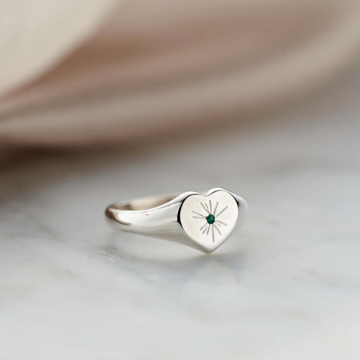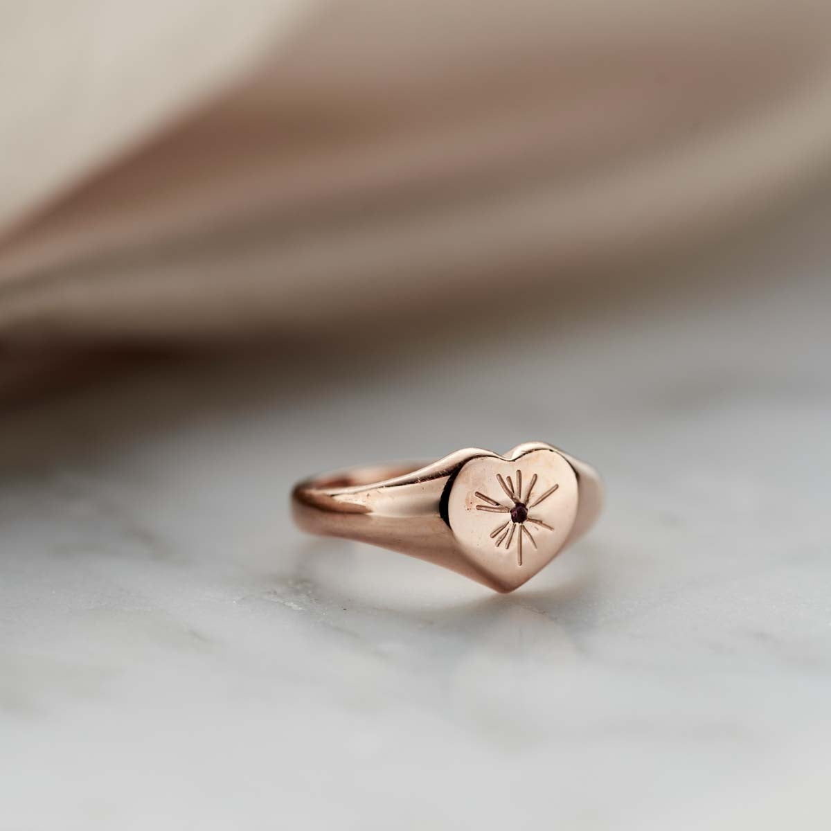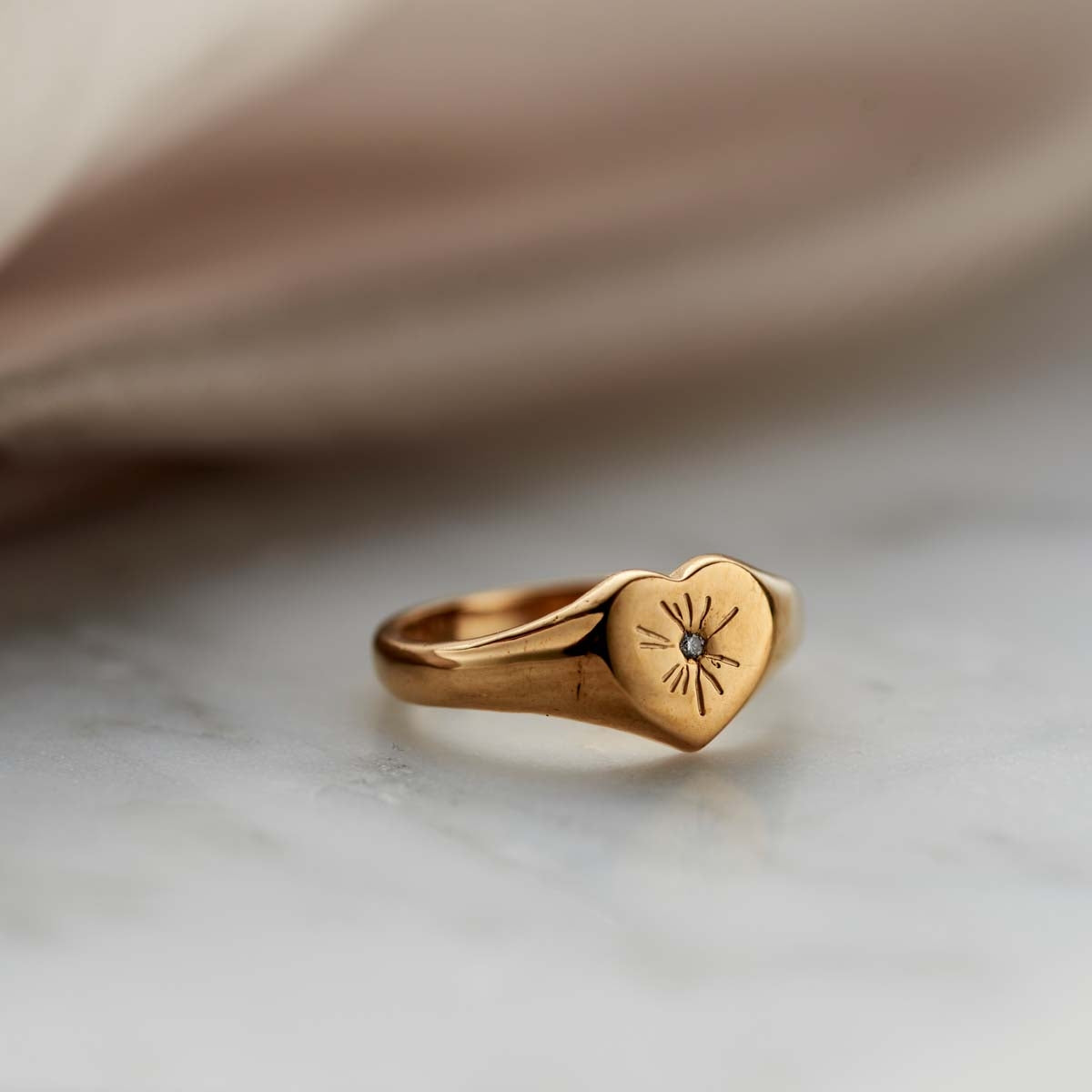With a diamond set in the centre of an engraved starburst, this Heart Shaped Signet Ring is sure to dazzle! Our jewellers can also personalise the Heart Signet Ring with your birthstone, and choice of either...